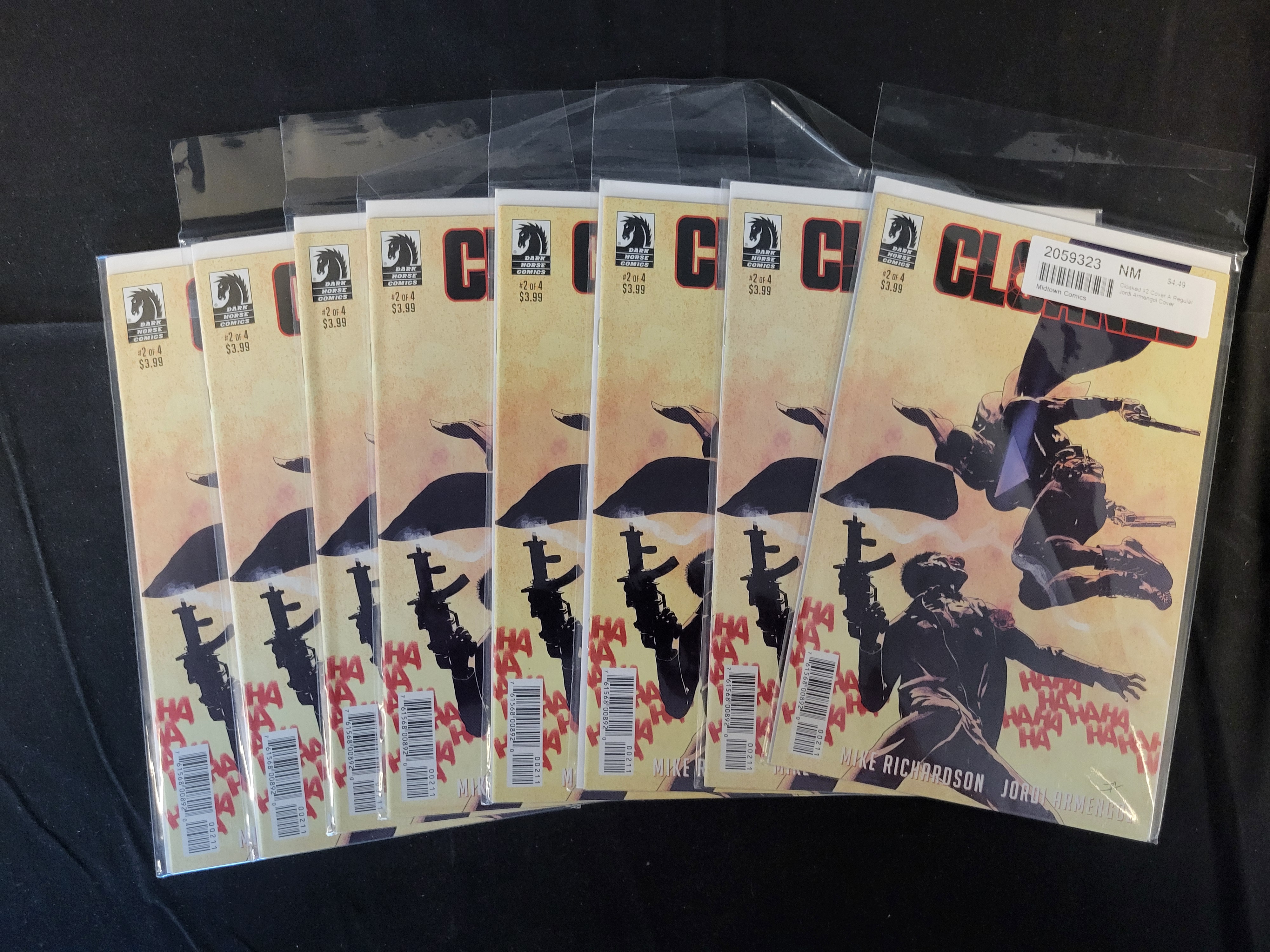 BID PER WHAT YOU SEE IN THE PHOTO, NOT THE AI GENERATED TITLES AND DESCRIPTIONS! A group of modern comic books featuring Cloaked issue 2 of 4, published by Dark Horse Comics in 2021. The cover art is the standard Cover A by Mike Richardson and Jordi Armengol, depicting silhouetted figures with firearms and repeating red HAHA text over a yellow background. Each copy is individually presented in a clear protective plastic sleeve. The cover includes the publisher logo, issue number, and original retail price of 3.99.