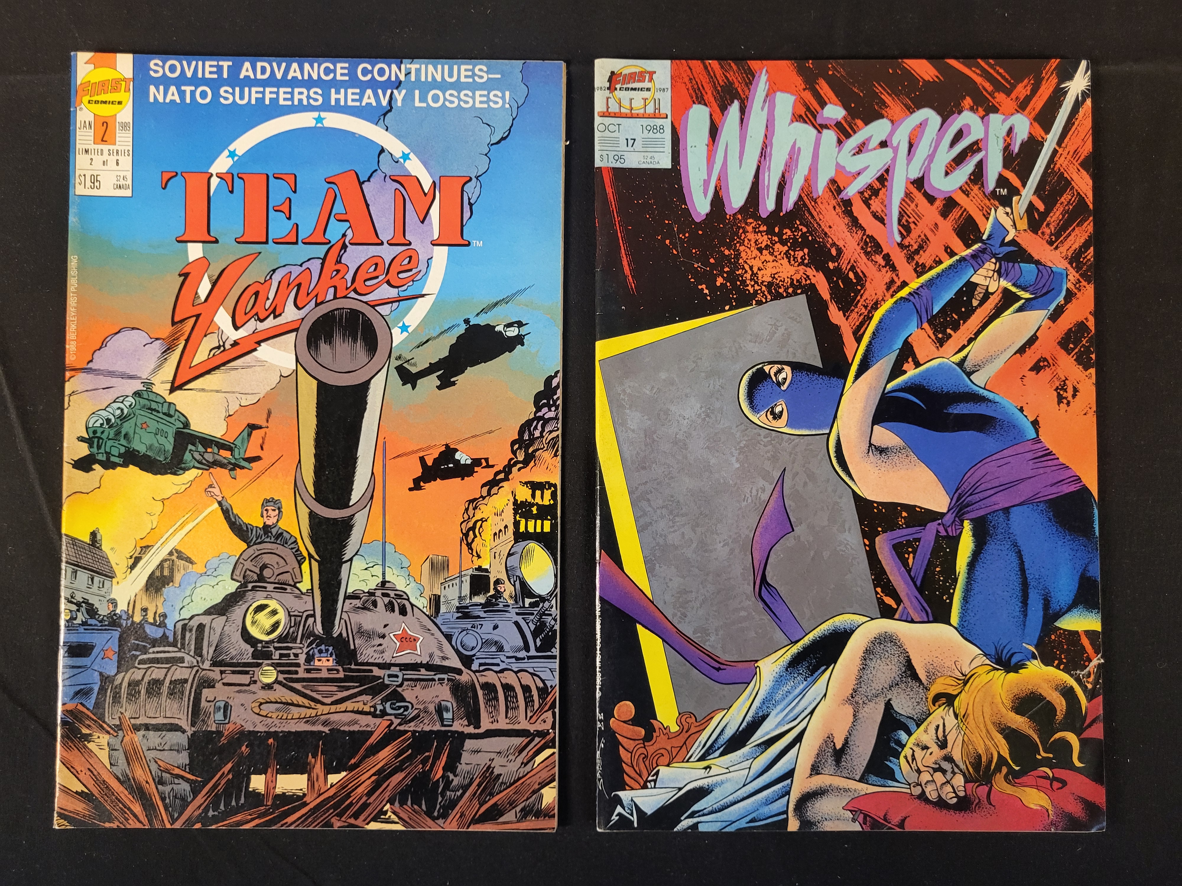 BID PER WHAT YOU SEE IN THE PHOTO, NOT THE AI GENERATED TITLES AND DESCRIPTIONS! This lot consists of two vintage comic books published by First Comics in the late 1980s. The first item is Whisper issue number 17, dated October 1988, which features a masked character in a blue and purple costume on the cover. The second item is Team Yankee issue number 2, dated January 1989, which is part of a limited series. The cover of the Team Yankee issue depicts a military engagement involving tanks and helicopters under the headline Soviet Advance Continues – NATO Suffers Heavy Losses. Both publications are standard format comic books with color illustrations.