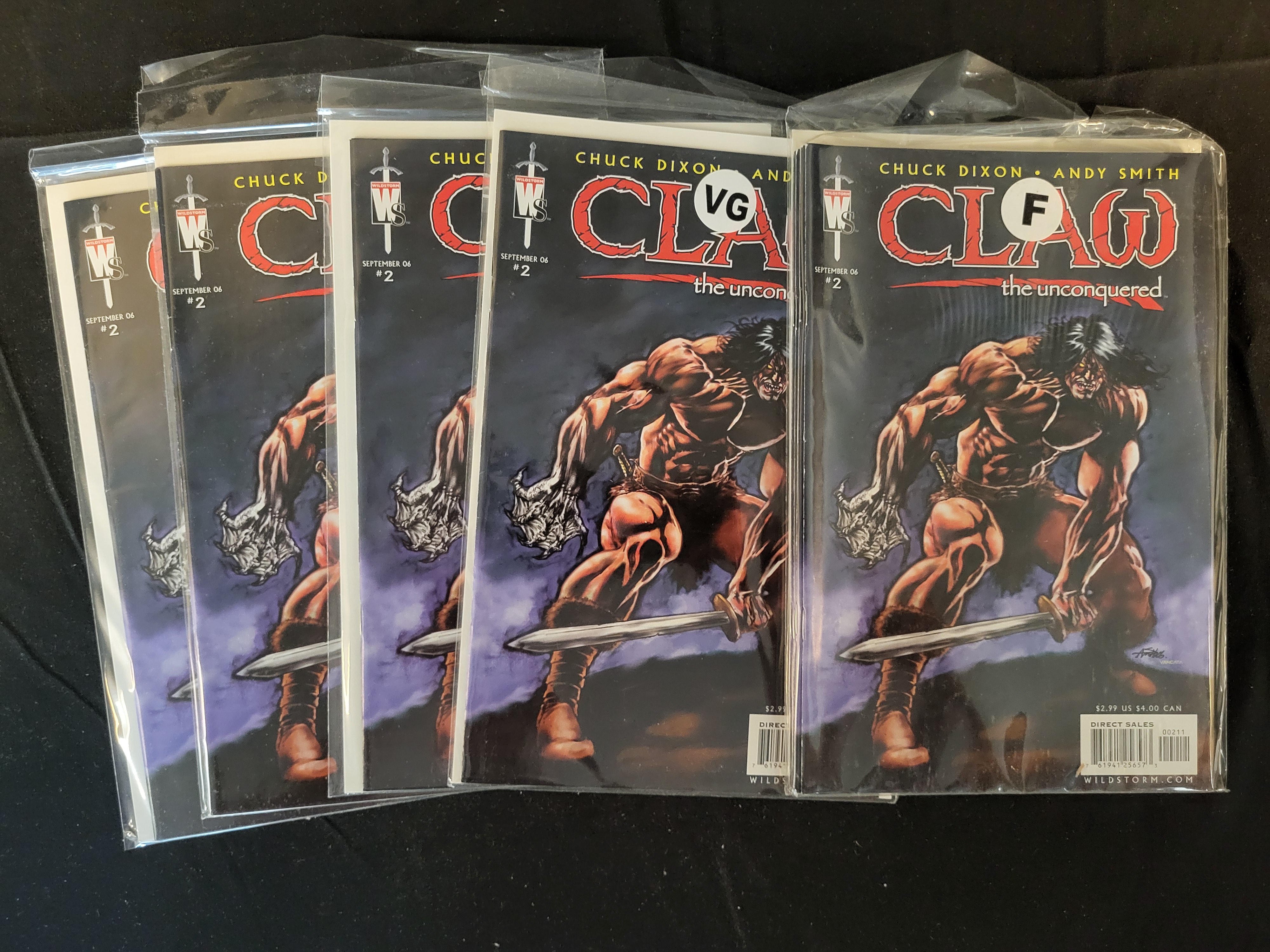BID PER WHAT YOU SEE IN THE PHOTO, NOT THE AI GENERATED TITLES AND DESCRIPTIONS! A collection of modern-age comic books titled Claw the Unconquered #2, published by Wildstorm in September 2006. The issues feature stories written by Chuck Dixon with cover and interior art by Andy Smith. The cover illustration depicts a barbarian character with a monstrous, clawed hand. Each comic is individually presented in a clear protective plastic sleeve with a white backing board. The front covers display the Wildstorm logo, issue number, date, and creator credits.