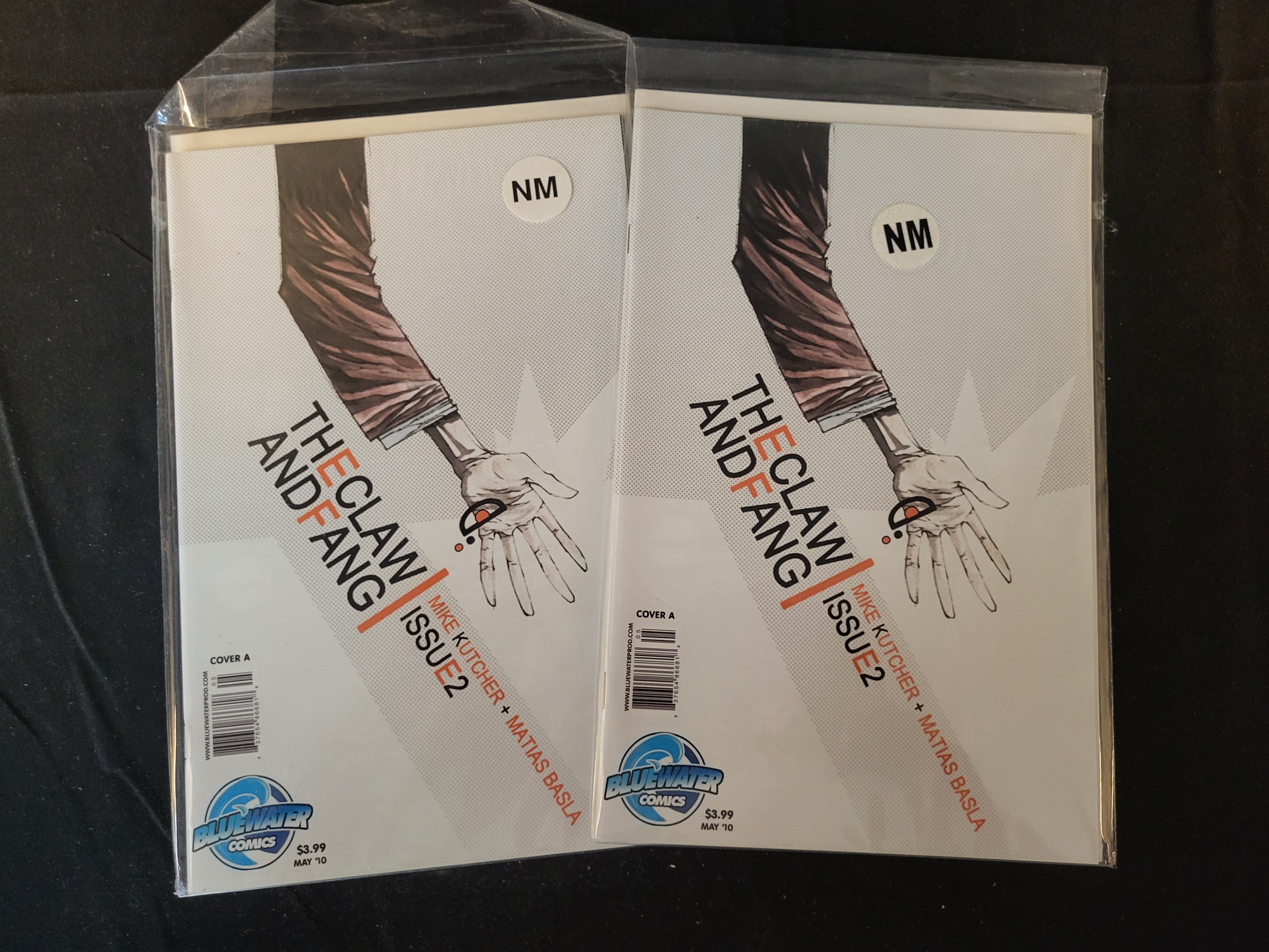BID PER WHAT YOU SEE IN THE PHOTO, NOT THE AI GENERATED TITLES AND DESCRIPTIONS! A pair of comic books titled Claw and Fang Issue 2, published by Bluewater Comics in May 2010. These copies feature Cover A with artwork by Michael Kutcher and Matias Basla. The cover illustration depicts a stylized arm and hand against a white background. The lower left corner of each cover displays the Bluewater Comics logo, a barcode, the publication date of May 2010, and the original retail price of $3.99. Each comic is housed in a clear protective plastic sleeve.