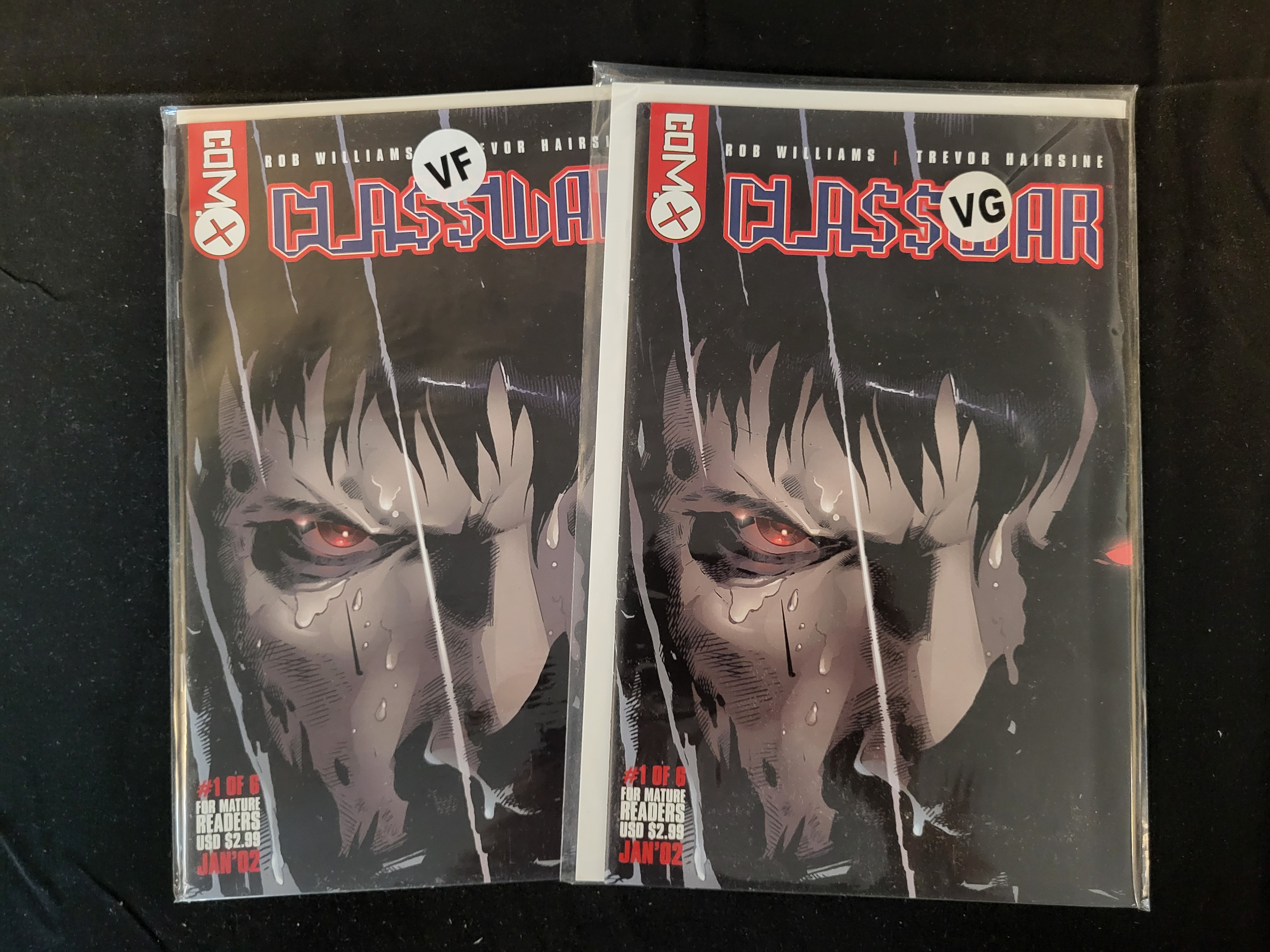 BID PER WHAT YOU SEE IN THE PHOTO, NOT THE AI GENERATED TITLES AND DESCRIPTIONS! A group of modern-era comic books featuring multiple copies of Cla$war issue 1 of 6, published by Com.x in January 2002. The series is written by Rob Williams with interior and cover art by Trevor Hairsine. The cover illustration features a close-up of a character face in the rain with glowing red eyes. Each copy is marked for mature readers and displays an original cover price of USD 2.99. The comics are housed in individual protective plastic sleeves.