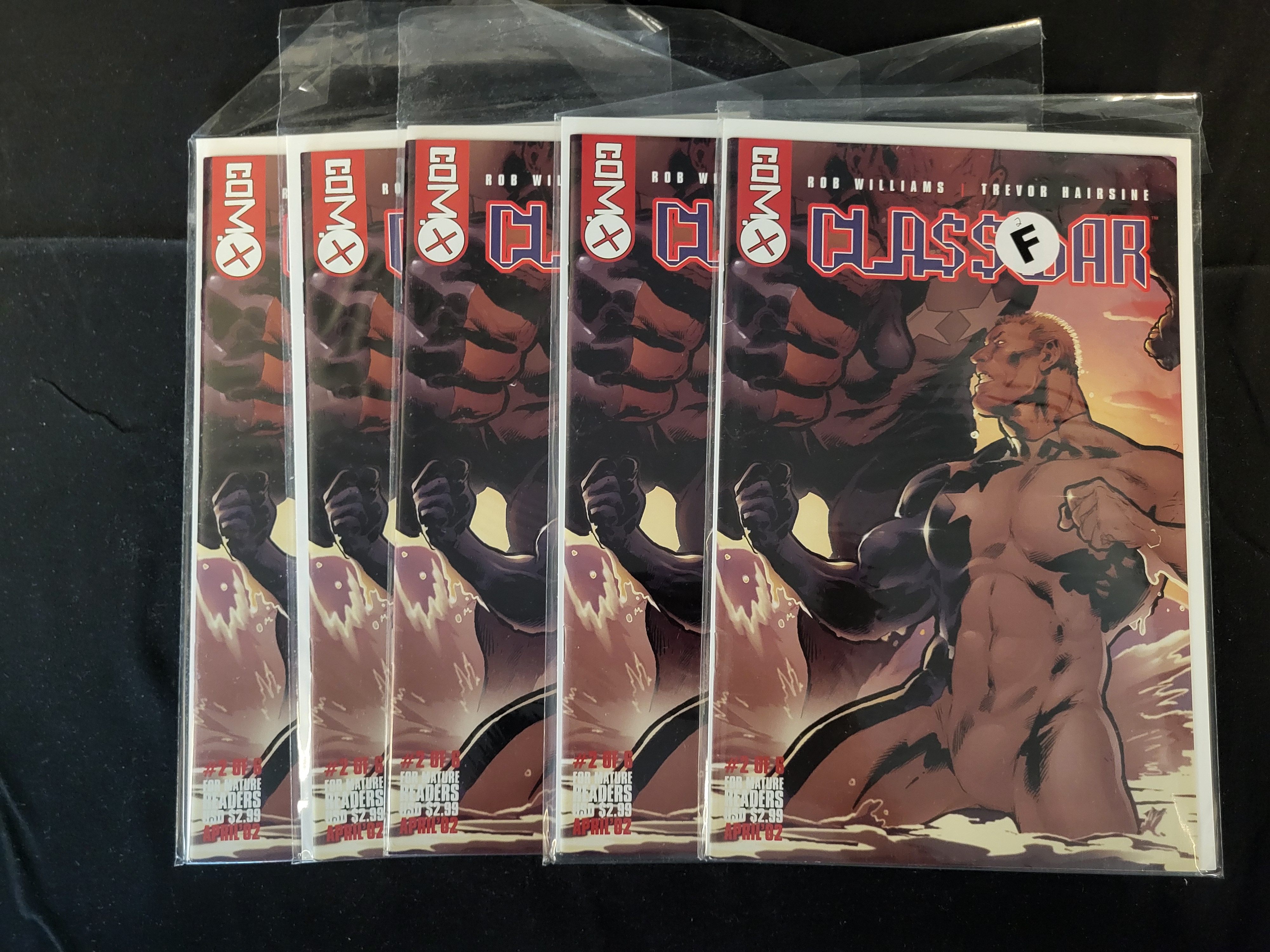 BID PER WHAT YOU SEE IN THE PHOTO, NOT THE AI GENERATED TITLES AND DESCRIPTIONS! A collection of comic books featuring issue #2 of the six-part series Cla$war, published by Comix in April 2002. The series is written by Rob Williams with illustrations by Trevor Hairsine. Each issue is designated for mature readers. The cover art depicts a stylized, muscular male figure in a dynamic pose. Each copy is individually housed in a protective plastic sleeve with a white backing board.