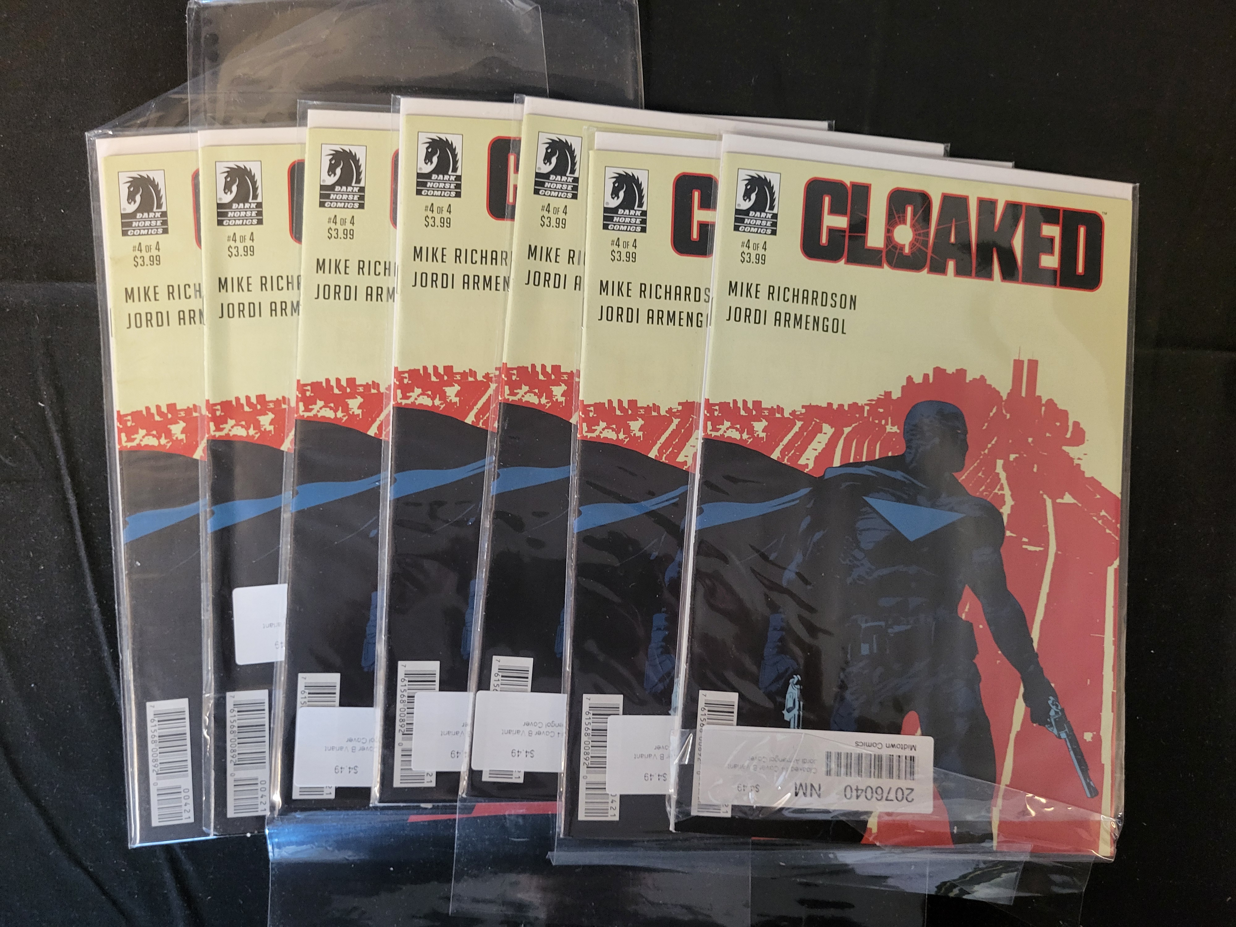 BID PER WHAT YOU SEE IN THE PHOTO, NOT THE AI GENERATED TITLES AND DESCRIPTIONS! A collection of modern comic books titled Cloaked, issue number 4 of a four-part limited series published by Dark Horse Comics in 2021. The series is written by Mike Richardson with artwork by Jordi Armengol. These copies feature the Jordi Armengol Variant B cover illustration, which depicts a silhouetted figure in costume against a stylized red and cream-colored urban skyline. Each comic is a first printing and is individually presented in a protective clear plastic sleeve. Several copies bear inventory labels from Midtown Comics identifying the items as the Armengol Cover B Variant.