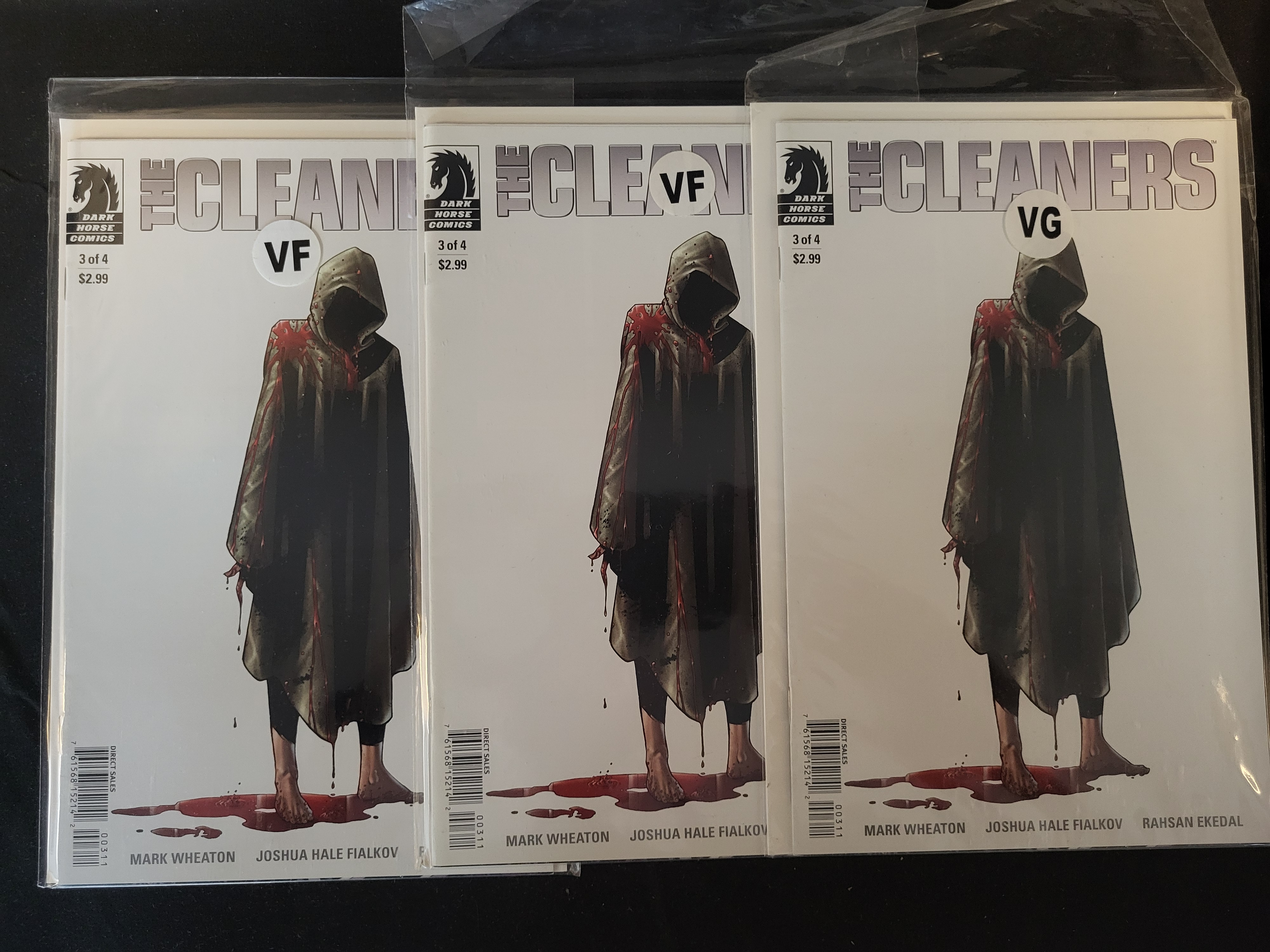 BID PER WHAT YOU SEE IN THE PHOTO, NOT THE AI GENERATED TITLES AND DESCRIPTIONS! A trio of contemporary comic books titled The Cleaners, issue number 3 of a 4-part limited series, published by Dark Horse Comics in 2008. The series is written by Mark Wheaton and Joshua Hale Fialkov with art by Rahsan Ekedal. Each copy features cover art depicting a hooded figure in a blood-stained poncho. The items are individually housed in clear protective plastic sleeves with white backing boards.