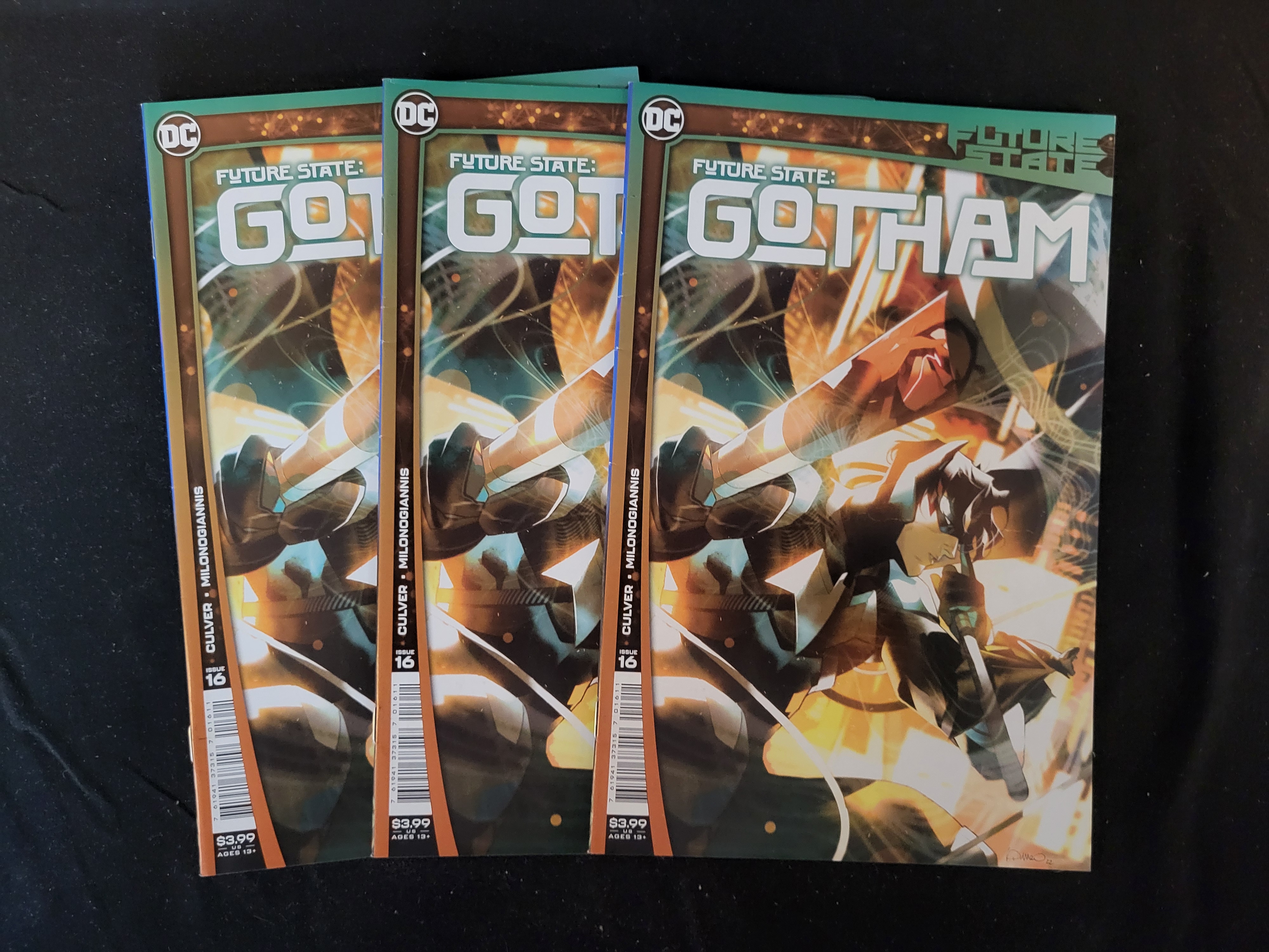 BID PER WHAT YOU SEE IN THE PHOTO, NOT THE AI GENERATED TITLES AND DESCRIPTIONS! A trio of DC Comics publications titled Future State: Gotham issue number 16. The covers feature artwork depicting a stylized character in a futuristic urban setting. The credits listed on the front cover include Culver and Milonogiannis. Each copy displays the DC logo in the upper left corner and the Future State logo in the upper right. The barcode and pricing information of 3.99 US are visible on the bottom left of the covers. These are standard format comic books with staple-bound construction.