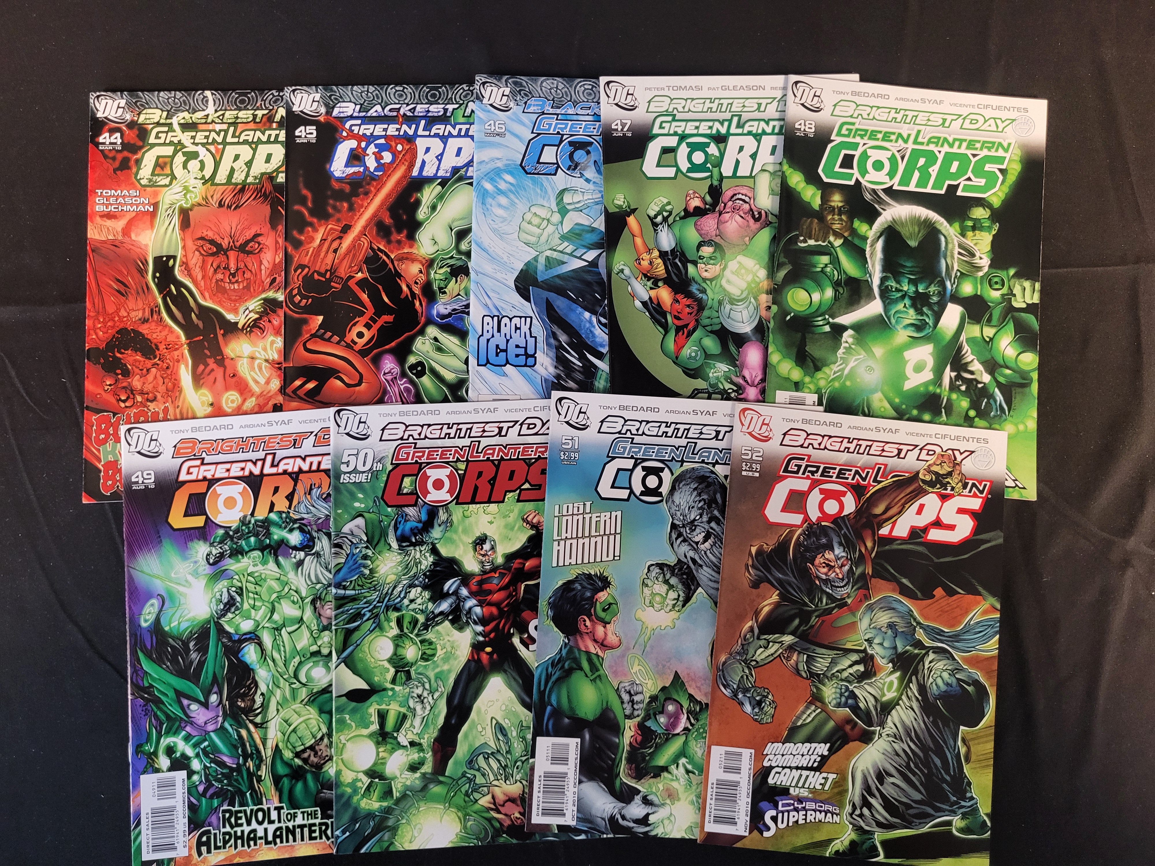 BID PER WHAT YOU SEE IN THE PHOTO, NOT THE AI GENERATED TITLES AND DESCRIPTIONS! A collection of Green Lantern Corps comic books published by DC Comics, from the series running between 2006 and 2011. The group includes multiple issues spanning numbers 44 through 52, with cover dates from 2010. These issues feature story arcs tied to the Blackest Night and Brightest Day crossover events. The covers feature color illustrations of characters such as Guy Gardner, John Stewart, and the Cyborg Superman. Credits for writers and artists include Peter J. Tomasi, Tony Bedard, and Ardian Syaf. The comics are individually housed in protective plastic sleeves and are printed on standard glossy paper.