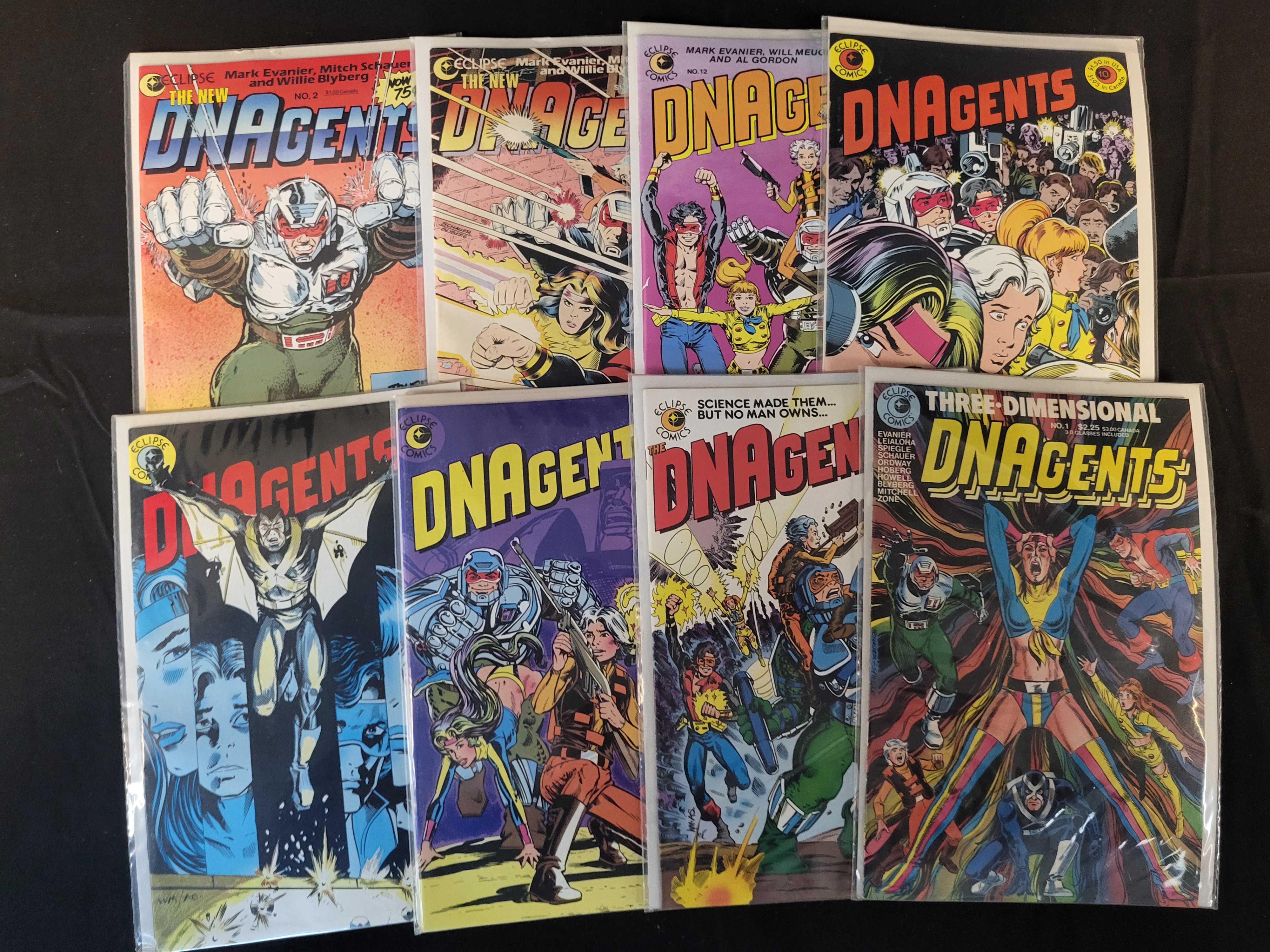BID PER WHAT YOU SEE IN THE PHOTO, NOT THE AI GENERATED TITLES AND DESCRIPTIONS! A collection of vintage comic books from the DNAgents and The New DNAgents series published by Eclipse Comics during the 1980s. The group includes various issues such as Three-Dimensional DNAgents No. 1 and regular series issues including numbers 2, 10, and 12. The publications feature stories and artwork by creators including Mark Evanier, Will Meugniot, Mitch Schauer, and Al Gordon. Each comic book is individually housed in a protective plastic sleeve. The items are constructed with staple-bound color covers and newsprint interior pages typical of the period.