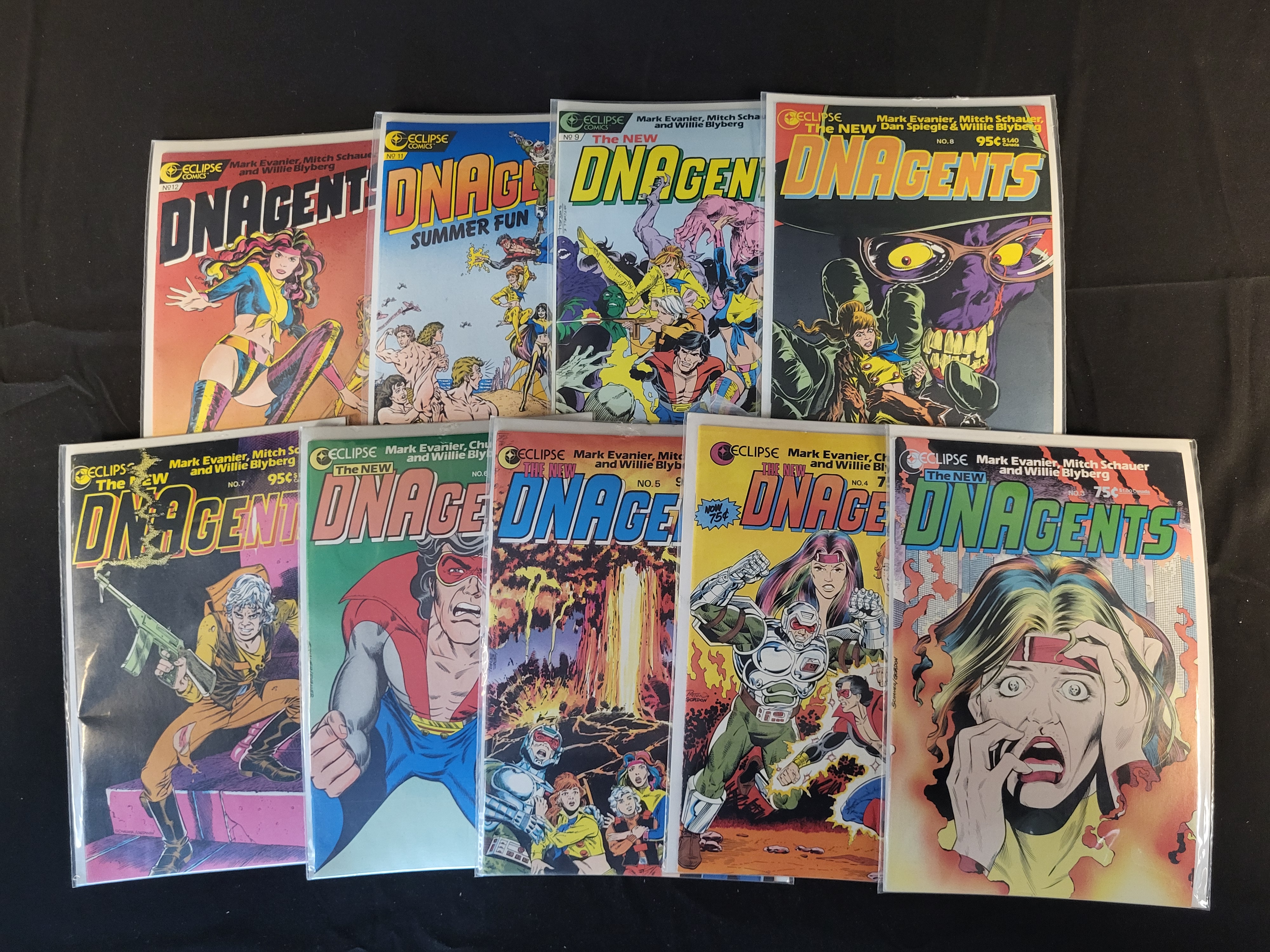 BID PER WHAT YOU SEE IN THE PHOTO, NOT THE AI GENERATED TITLES AND DESCRIPTIONS! A collection of vintage comic books from the DNAgents series published by Eclipse Comics during the mid-1980s. The group includes various issues from The NEW DNAgents and DNAgents Summer Fun titles. Credits for cover art and stories include Mark Evanier, Mitch Schauer, Willie Blyberg, and Dan Spiegle. Each comic is individually presented in a clear plastic protective sleeve. The publications feature color illustrations on standard comic book paper stock.