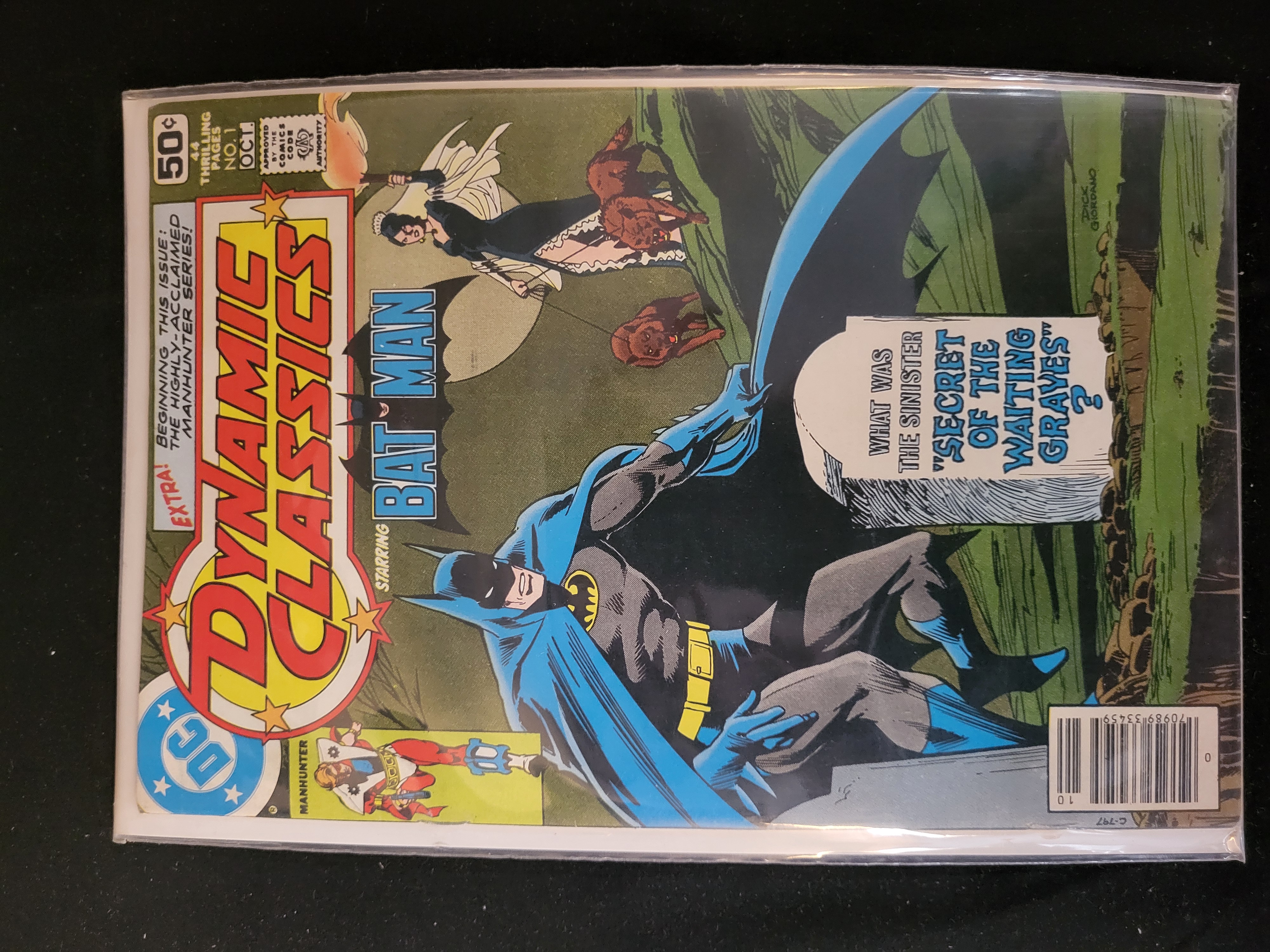 BID PER WHAT YOU SEE IN THE PHOTO, NOT THE AI GENERATED TITLES AND DESCRIPTIONS! Dynamic Classics No. 1 published by DC Comics and dated October 1978. This Bronze Age comic book features Batman in the story Secret of the Waiting Graves and includes the Manhunter series. The cover art is by Dick Giordano, with interior contributions by Neal Adams, Dennis O’Neil, and Archie Goodwin. The front cover displays a 50-cent price point, the DC bullet logo, a UPC barcode, and the Comics Code Authority seal. The issue is a standard format comic book printed on newsprint with a glossy cover.