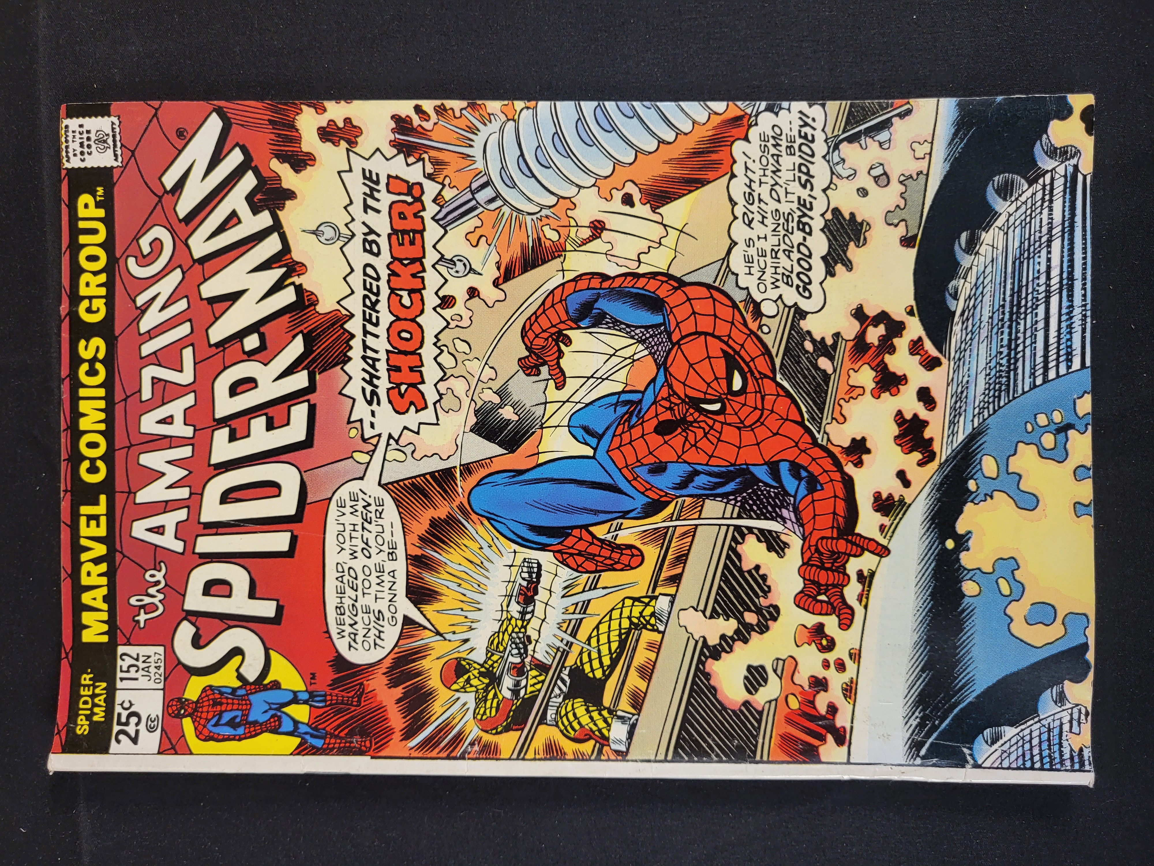 BID PER WHAT YOU SEE IN THE PHOTO, NOT THE AI GENERATED TITLES AND DESCRIPTIONS! A single issue of The Amazing Spider-Man #152, published by the Marvel Comics Group with a cover date of January 1976. This Bronze Age comic book features cover art depicting Spider-Man in combat with the villain The Shocker. The cover includes the headline –SHATTERED BY THE SHOCKER! along with various dialogue bubbles. The front cover displays a 25-cent price point and the Comics Code Authority seal in the upper left corner. The publication is part of the long-running Marvel Comics series.