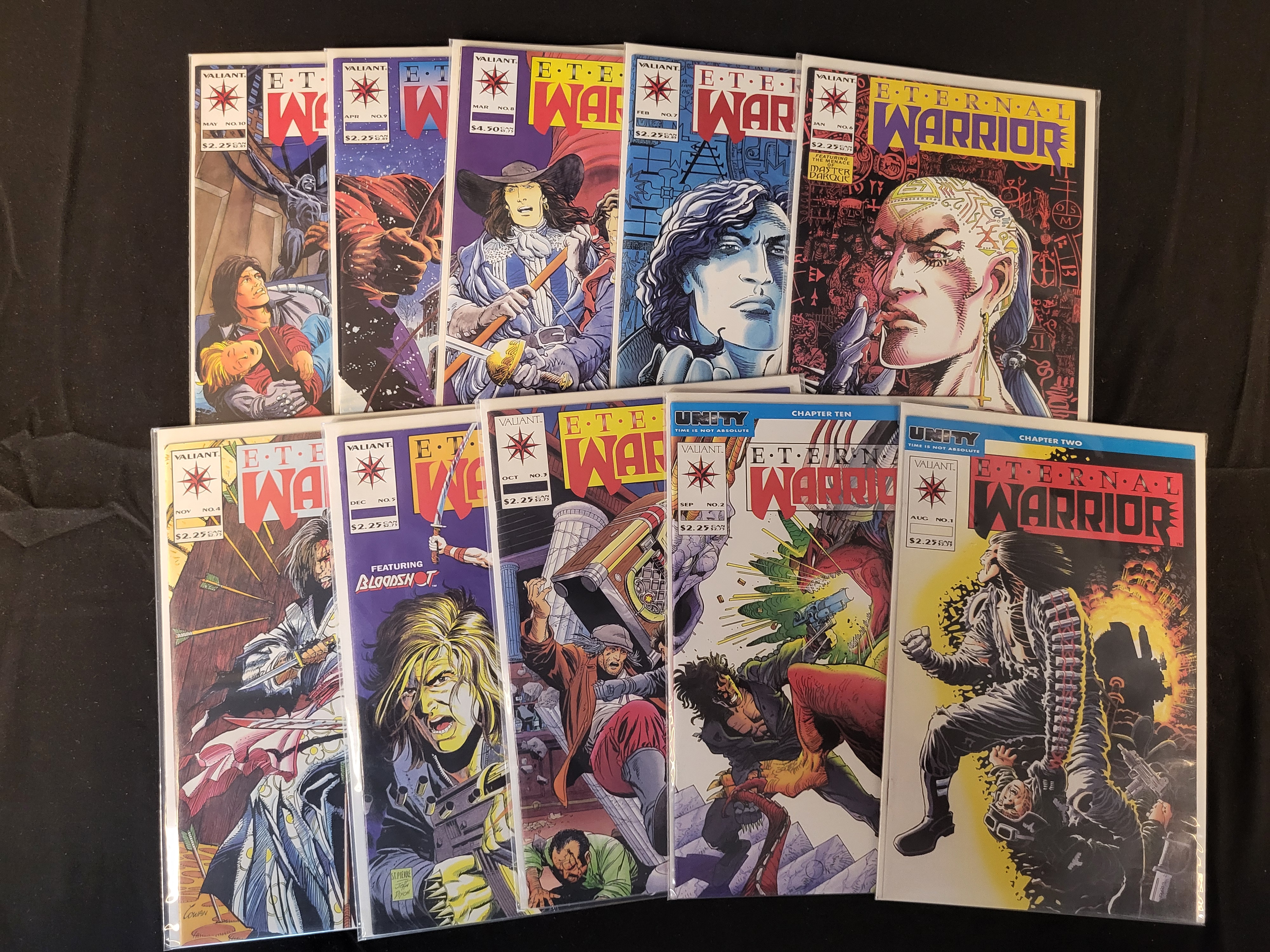 BID PER WHAT YOU SEE IN THE PHOTO, NOT THE AI GENERATED TITLES AND DESCRIPTIONS! This group of comic books consists of the Eternal Warrior series published by Valiant Comics in the early 1990s. The collection includes consecutive issues from number 1 through number 10. The covers feature characters Gilad Anni-Padda and Bloodshot, with storylines including chapters from the Unity crossover event. Specifically, issue number 1 is identified as Unity Chapter Two and issue number 2 is identified as Unity Chapter Ten. The comics are printed with color illustrations on standard paper stock. Each issue displays the original cover price, ranging from 2.25 to 4.95 dollars, along with the month and year of publication. Each comic is individually housed in a clear protective plastic sleeve with a white backing board.