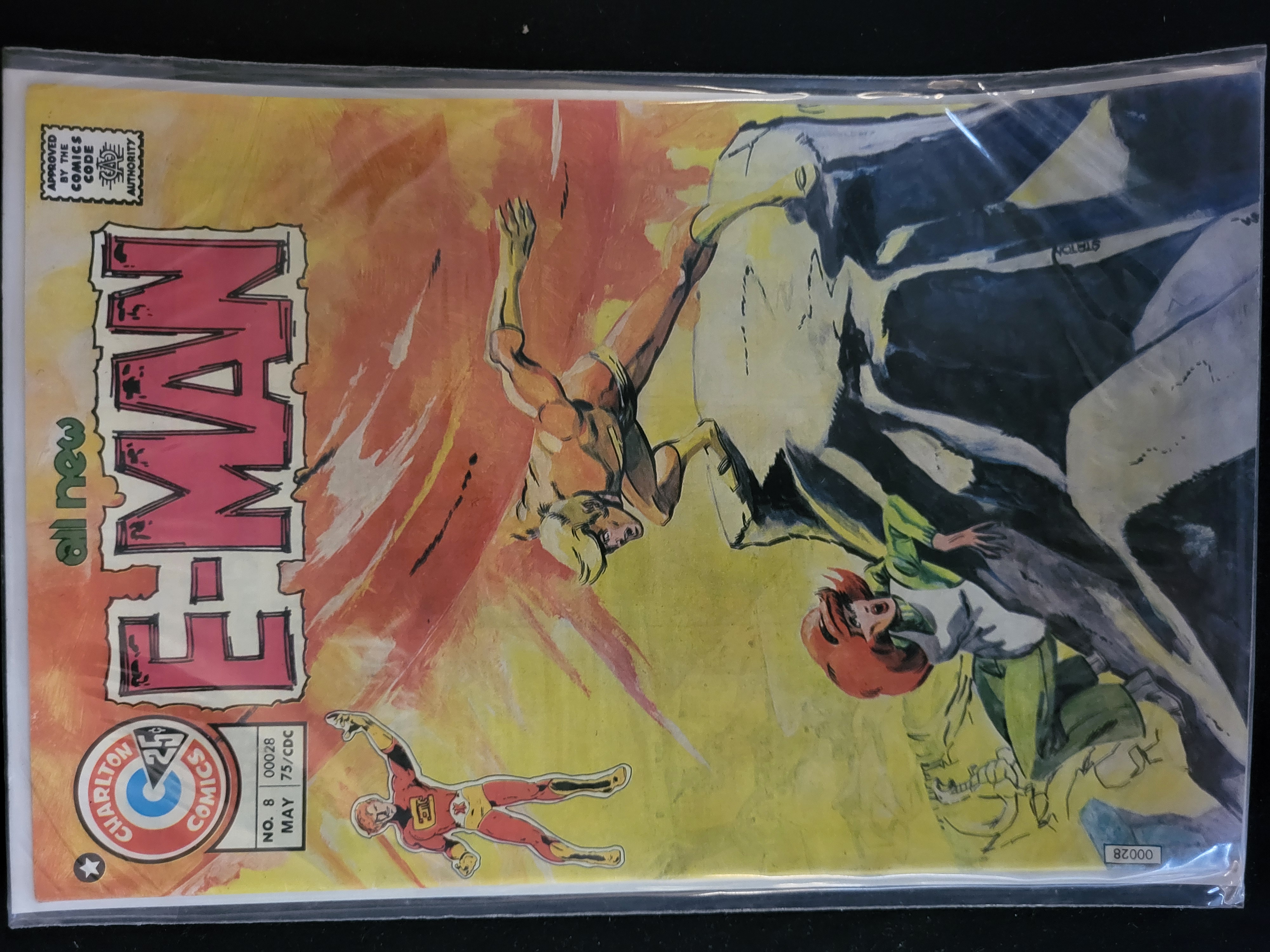 BID PER WHAT YOU SEE IN THE PHOTO, NOT THE AI GENERATED TITLES AND DESCRIPTIONS! This issue of E-Man, number 8, was published by Charlton Comics in May 1975. The comic features a painterly cover illustration by artist Joe Staton, depicting the characters E-Man and Nova Kane. This issue contains the story titled The Inner Sun. The front cover displays the Approved by the Comics Code Authority seal and an original retail price of 25 cents. The item is a standard format comic book printed on paper and is currently housed in a protective plastic sleeve with a white backing board. Two small identifying stickers printed with the number 00028 are affixed to the front cover, one near the bottom right and one within the issue information box at the bottom left.