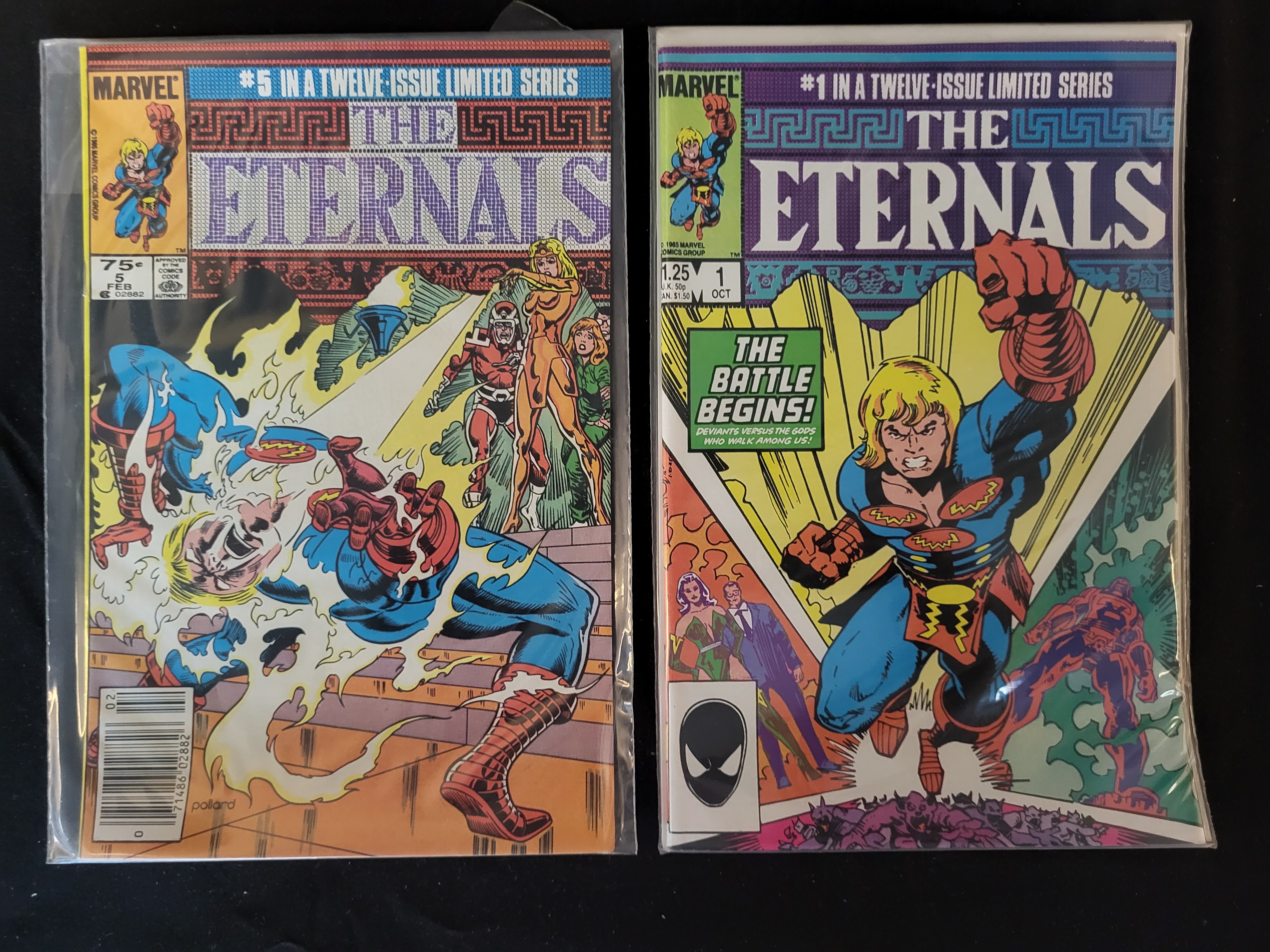 BID PER WHAT YOU SEE IN THE PHOTO, NOT THE AI GENERATED TITLES AND DESCRIPTIONS! This lot consists of two comic books from the 1985 twelve-issue limited series titled The Eternals, published by the Marvel Comics Group. The collection includes issue number 1, dated October 1985, and issue number 5, dated February 1986. Issue number 1 features cover art with the text The Battle Begins! and shows a central character in a dynamic pose. Issue number 5 depicts multiple characters in a combat scene. Both publications are presented in clear protective plastic sleeves with white backing boards. The covers display the Marvel logo, issue numbers, dates, and original retail prices.
