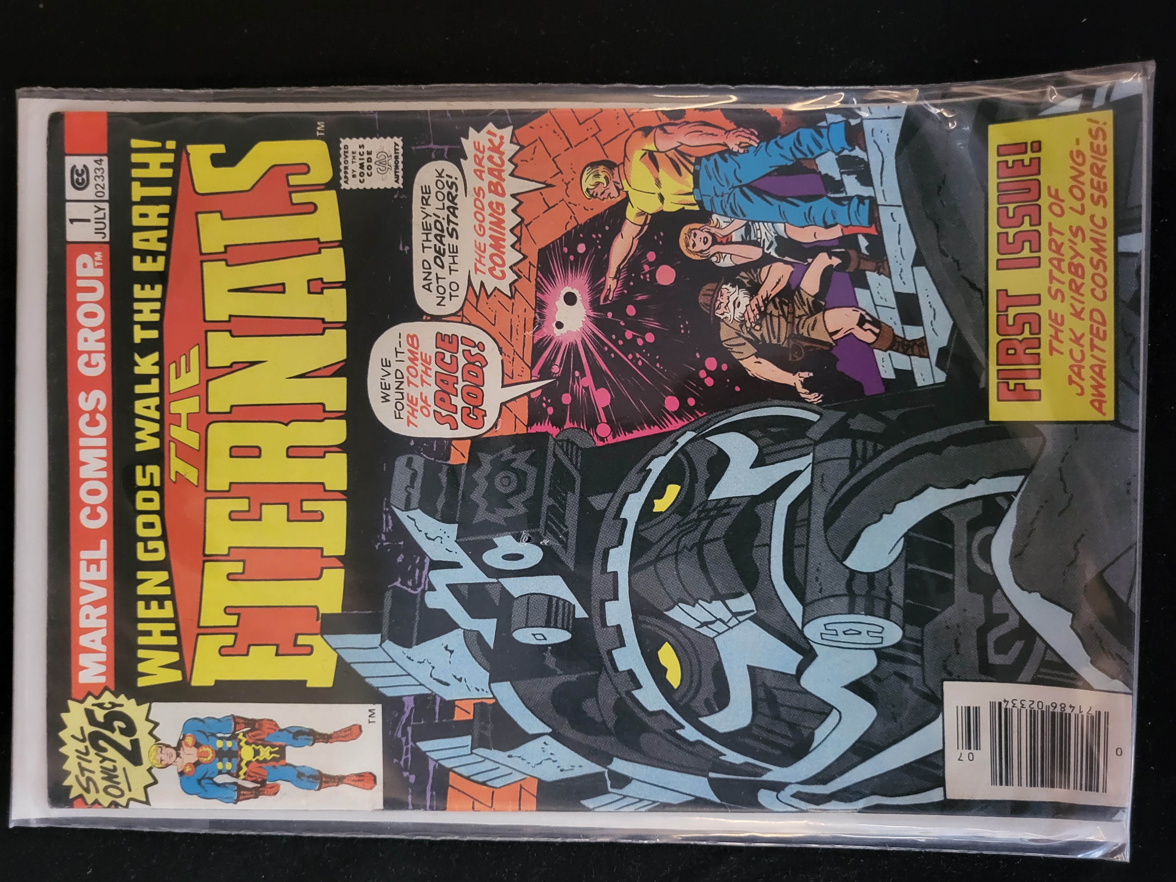 BID PER WHAT YOU SEE IN THE PHOTO, NOT THE AI GENERATED TITLES AND DESCRIPTIONS! This is a Bronze Age comic book, The Eternals #1, published by Marvel Comics Group with a cover date of July 1976. The issue features the first appearance and origin of the Eternals, written and illustrated by Jack Kirby. The cover art depicts characters discovering The Tomb of the Space Gods. Front cover text includes First Issue!, When Gods Walk the Earth!, and a price point of 25 cents. The Marvel Comics Group vertical banner is present on the left edge, along with the Comics Code Authority seal and a UPC barcode in the lower right corner. The comic is printed on newsprint with a glossy cover.