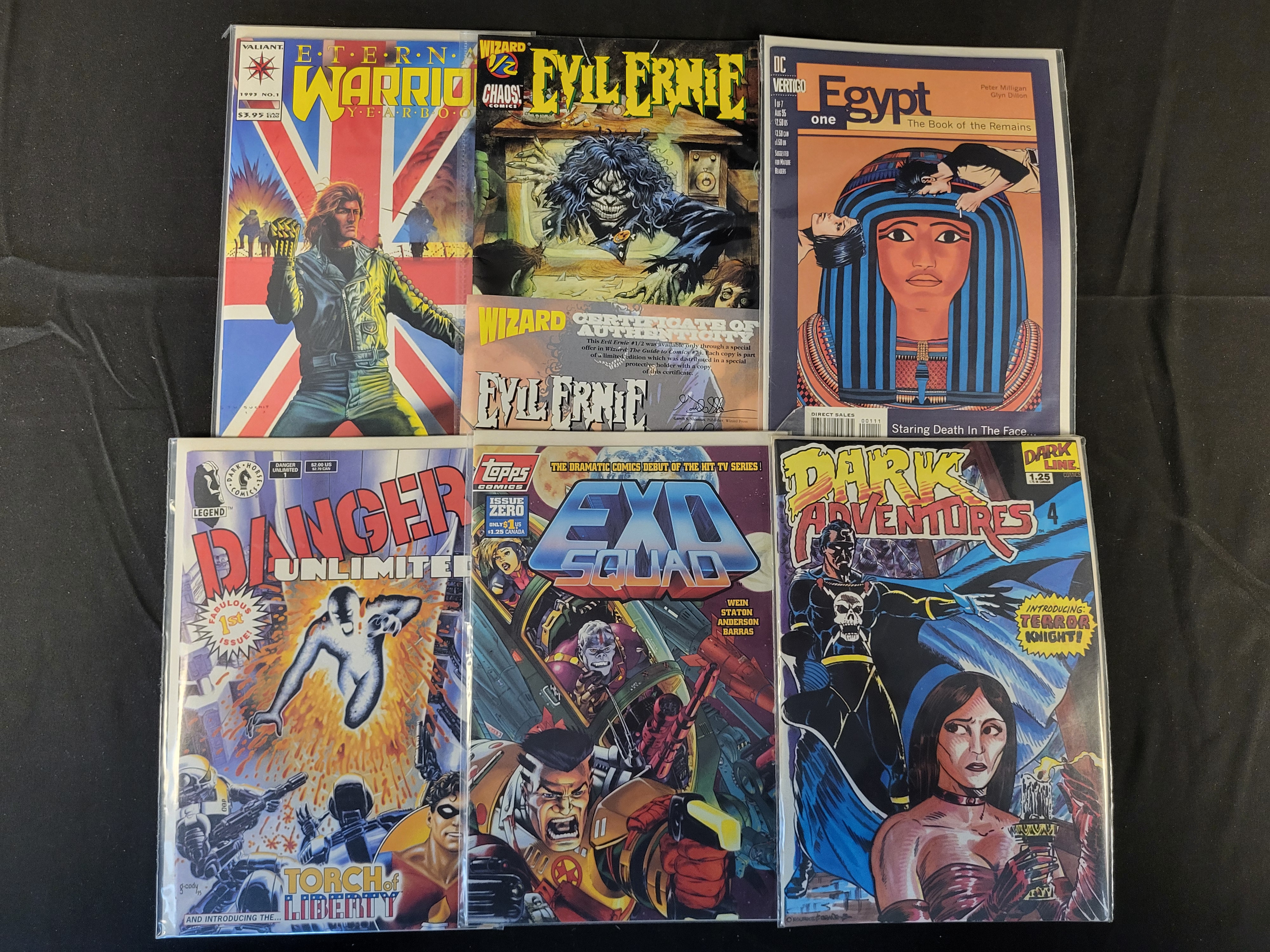 BID PER WHAT YOU SEE IN THE PHOTO, NOT THE AI GENERATED TITLES AND DESCRIPTIONS! A collection of modern-era comic books featuring the Topps Comics Exo-Squad Issue Zero (1994). The group includes various titles from publishers such as Chaos! Comics, Valiant, DC Vertigo, Dark Horse, and Dark Line. Notable issues include Evil Ernie Wizard 1/2 edition with an included Wizard Certificate of Authenticity, Eternal Warrior Yearbook (1993, No. 1), Egypt: The Book of the Remains (Issue one, 1995), Danger Unlimited (#1), and Dark Adventures (#4). The comics cover genres including science fiction, superhero, and horror. Each comic is individually housed in a protective plastic sleeve.