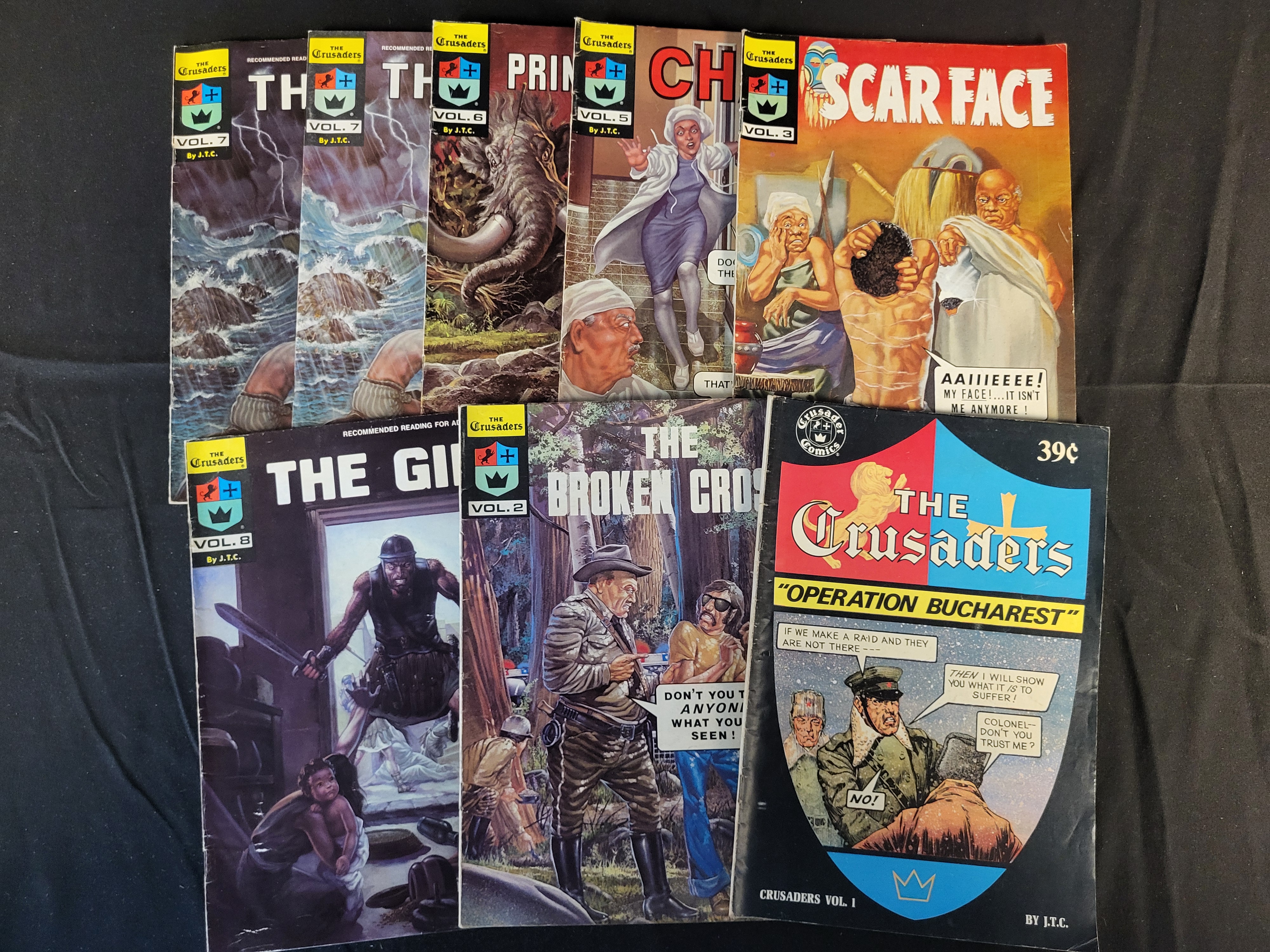 BID PER WHAT YOU SEE IN THE PHOTO, NOT THE AI GENERATED TITLES AND DESCRIPTIONS! A collection of vintage religious and historical comic books from The Crusaders series, written by Jack T. Chick (J.T.C.) and published by Chick Publications. The series is associated with the Bronze and Copper Age of comic book production. This group includes various titles such as Operation Bucharest (Vol. 1), The Broken Cross (Vol. 2), Scar Face (Vol. 3), and The Gift (Vol. 8). The publications feature illustrative cover art and are constructed with paper covers and stapled bindings. One issue displays an original 39-cent retail price on the front cover.