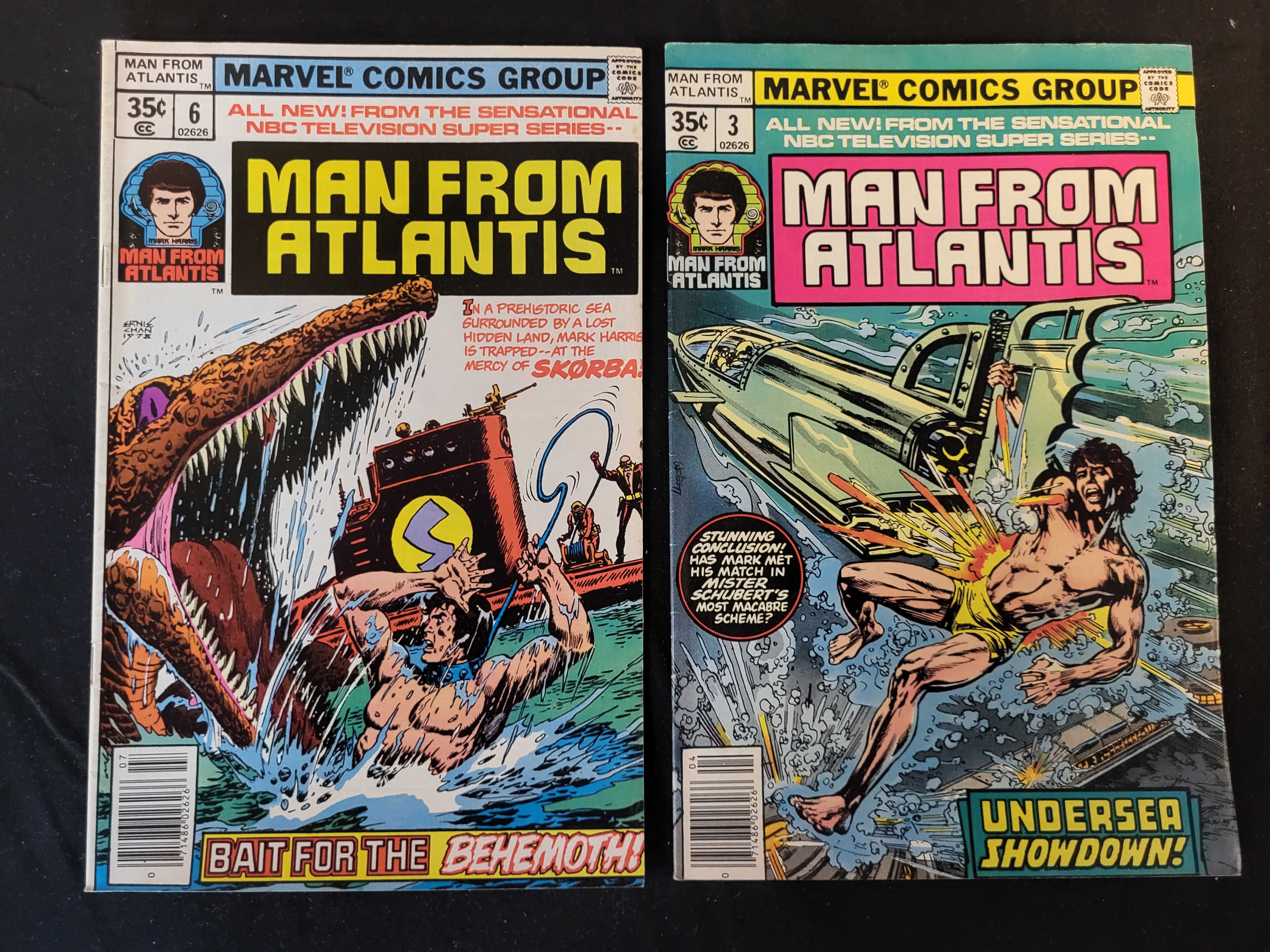 BID PER WHAT YOU SEE IN THE PHOTO, NOT THE AI GENERATED TITLES AND DESCRIPTIONS! A pair of vintage comic books published by Marvel Comics Group, based on the 1970s NBC television series Man From Atlantis. The lot includes issue number 3, dated April 1978, titled Undersea Showdown!, and issue number 6, dated July 1978, titled Bait for the Behemoth!. Both issues feature a 35-cent original cover price. The cover art for issue 3 depicts an underwater scene with a submersible vehicle, while issue 6 illustrates a confrontation with a prehistoric sea creature. Each comic displays the Marvel Comics Group banner, the series title, and the Comics Code Authority seal. The books are constructed from standard newsprint comic stock with illustrated covers.