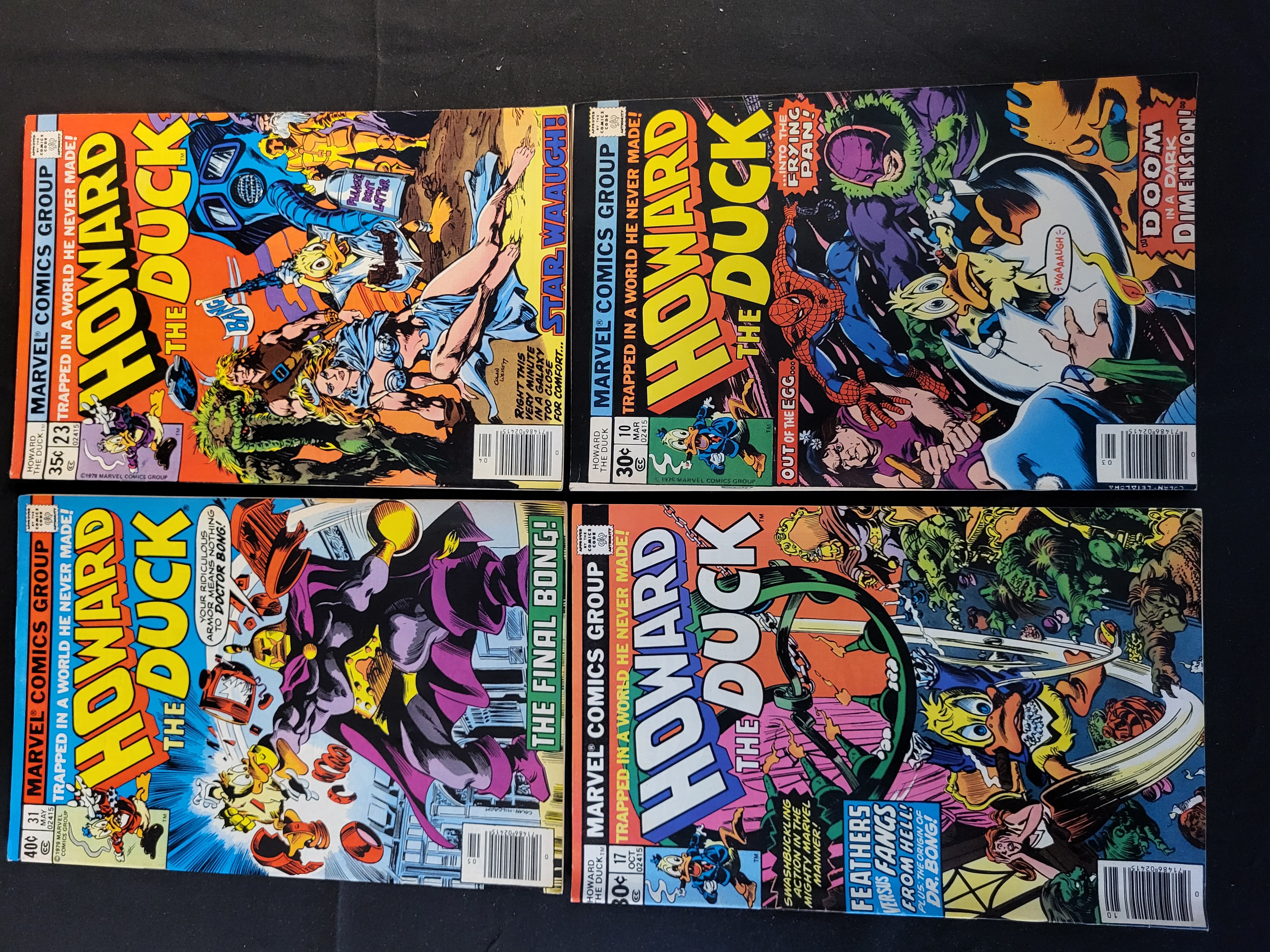 BID PER WHAT YOU SEE IN THE PHOTO, NOT THE AI GENERATED TITLES AND DESCRIPTIONS! This group of Marvel Comics Group Howard the Duck comic books dates from the late 1970s. The collection includes issue No. 10 (March 1977), featuring a guest appearance by Spider-Man; No. 17 (October 1977), detailing the origin of Dr. Bong; No. 23 (April 1978), featuring a Star Waaugh! parody; and No. 31 (May 1979), titled The Final Bong!. These Bronze Age publications feature original newsstand price markings of 30, 35, and 40 cents. The covers display illustrations by artists including Gene Colan and Klaus Janson. Each book is a standard format comic with color illustrations and newsprint interior pages.