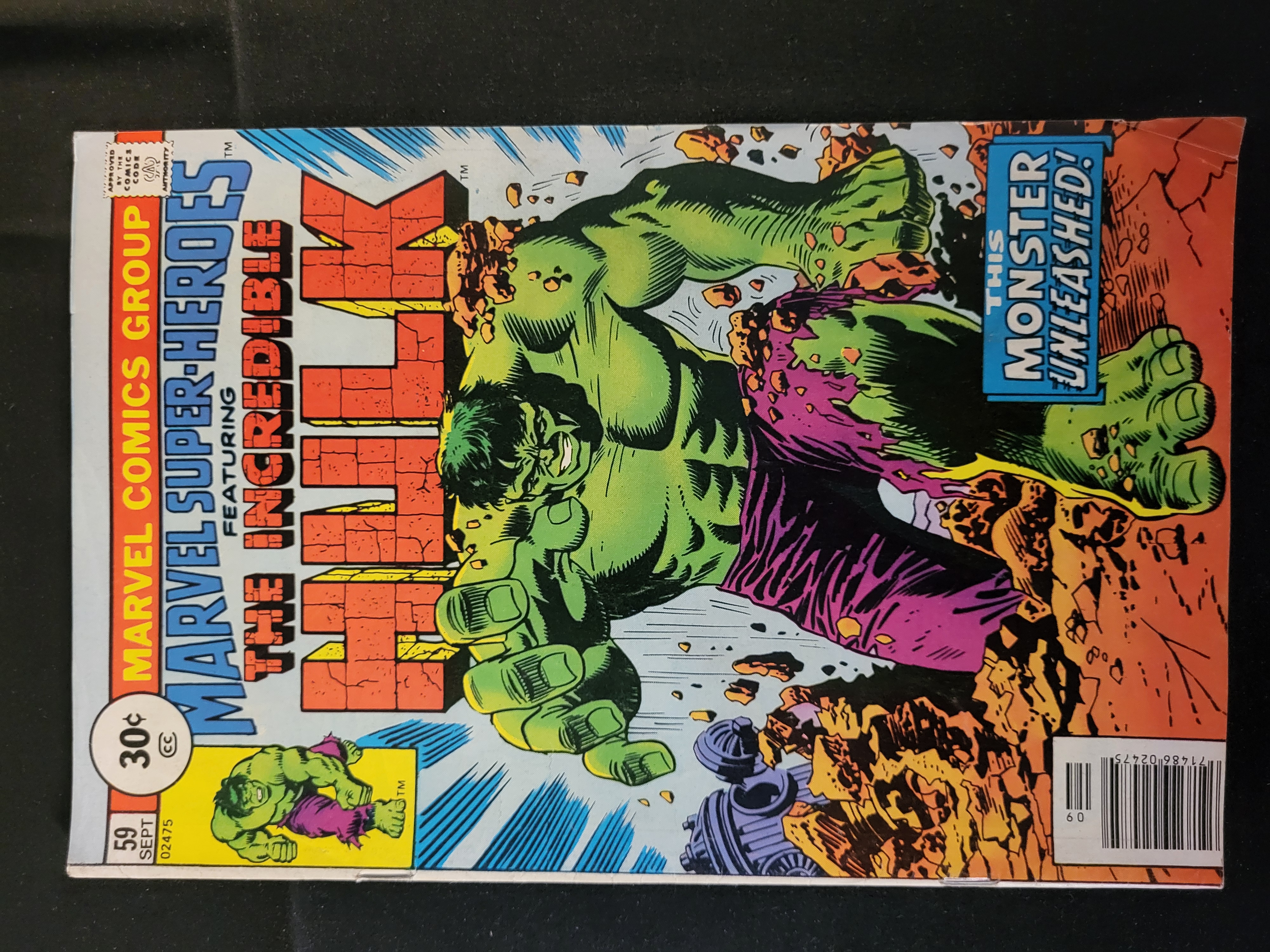 BID PER WHAT YOU SEE IN THE PHOTO, NOT THE AI GENERATED TITLES AND DESCRIPTIONS! Marvel Super-Heroes issue number 59, published by Marvel Comics Group with a cover date of September 1976. The cover art features a full-color illustration of the Incredible Hulk breaking through rocky ground, accompanied by the text THIS MONSTER UNLEASHED!. This issue features the Hulk and the Sub-Mariner, reprinting material from Incredible Hulk number 105. The front cover includes a 30-cent price point, the Comics Code Authority seal in the upper left corner, and a barcode in the lower right corner. The comic is a standard-sized publication printed on newsprint with a color-printed cover.