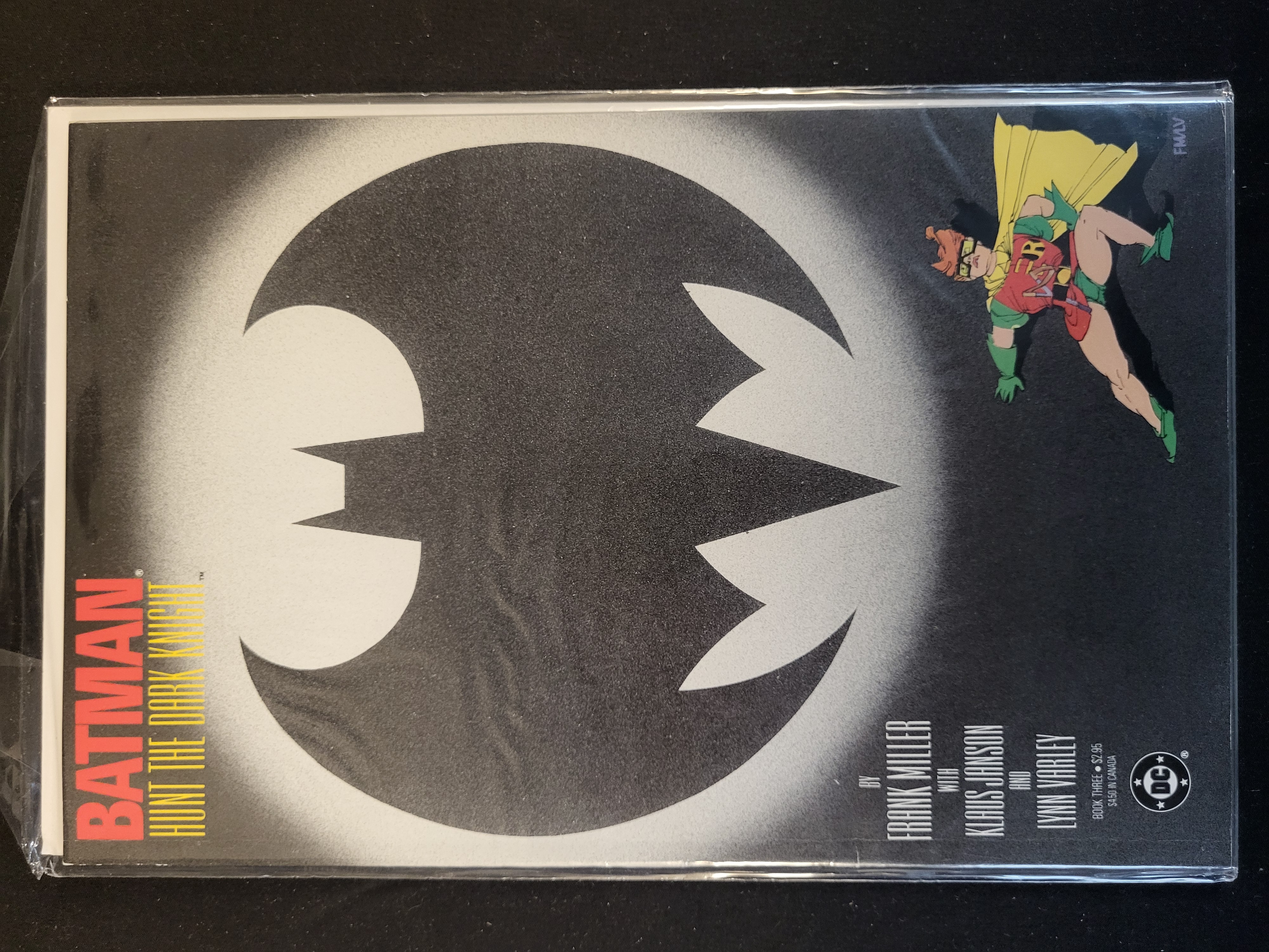 BID PER WHAT YOU SEE IN THE PHOTO, NOT THE AI GENERATED TITLES AND DESCRIPTIONS! This modern age comic book is titled Batman: Hunt the Dark Knight, published by DC Comics as Book Three of the limited series Batman: The Dark Knight Returns. The cover art features a large black stylized bat symbol centered within a white circular spotlight, with an illustration of the Carrie Kelley version of Robin in the upper right corner. Printed credits identify the creators as Frank Miller, Klaus Janson, and Lynn Varley. The original cover price is listed as $2.95 ($4.50 in Canada). The comic is housed in a protective plastic sleeve with a white backing board.