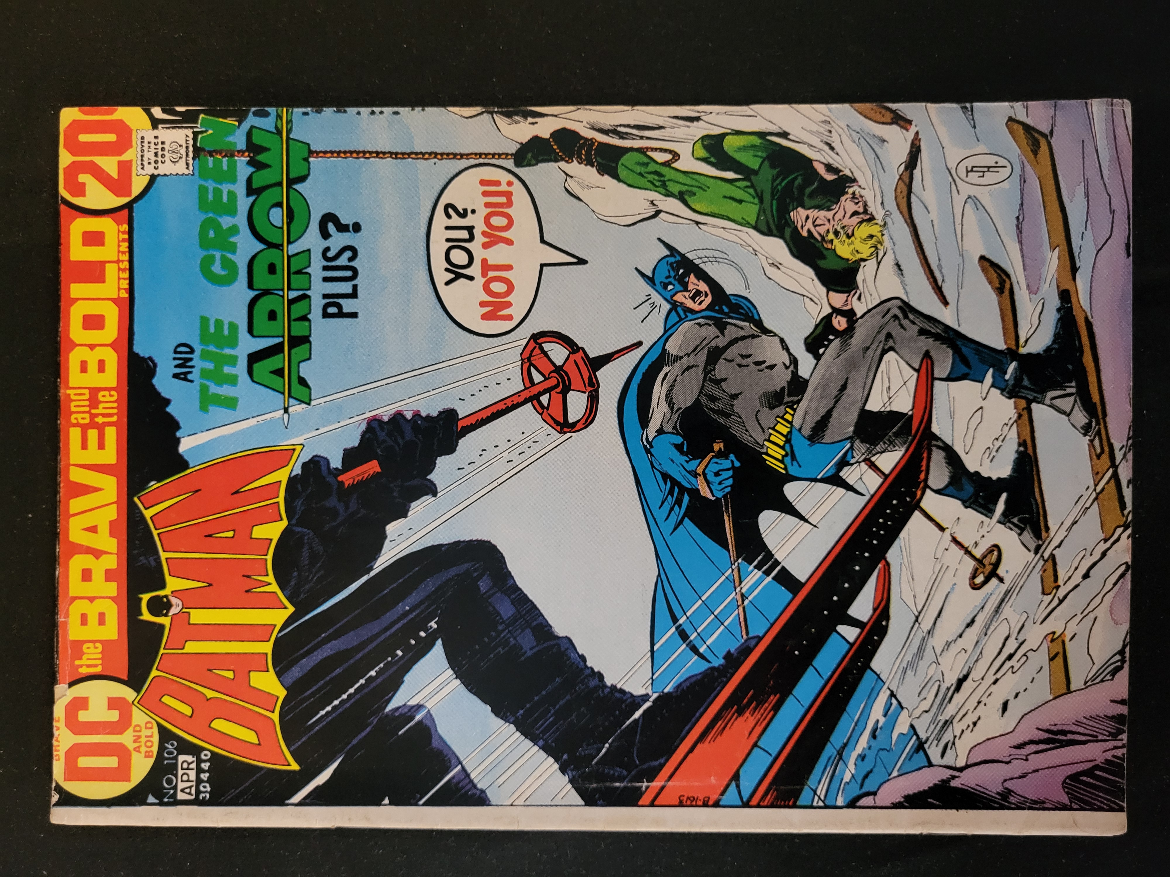 BID PER WHAT YOU SEE IN THE PHOTO, NOT THE AI GENERATED TITLES AND DESCRIPTIONS! A vintage DC Comics publication, The Brave and the Bold issue No. 106, featuring a team-up between Batman and Green Arrow. This Bronze Age comic book is dated April 1973 and carries an original cover price of 20 cents. The cover art, attributed to Jim Aparo, depicts Batman and Green Arrow in a snowy setting. The publication includes the series masthead, issue number, and the Comics Code Authority seal. It is presented in its original staple-bound softcover format.