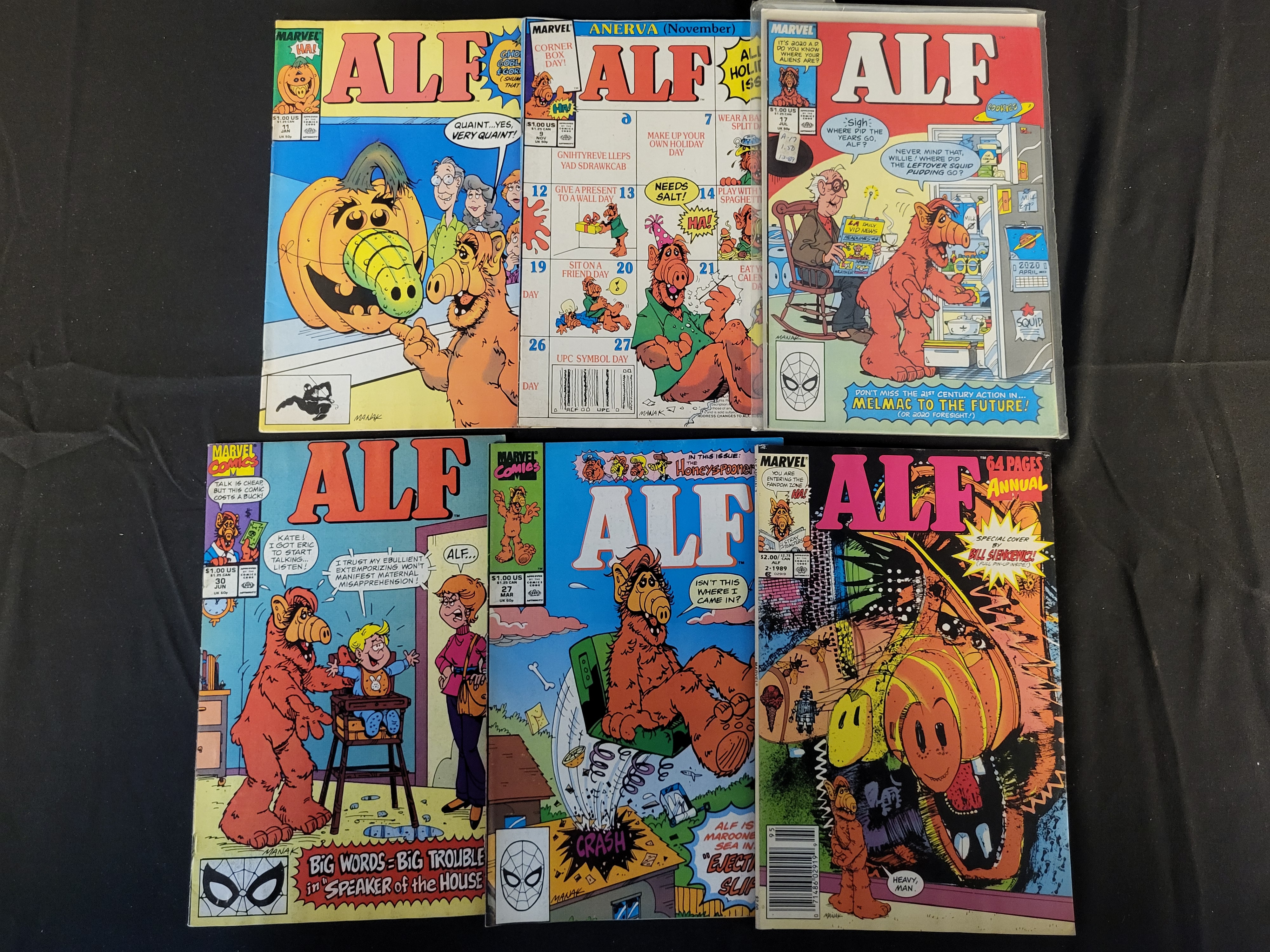 BID PER WHAT YOU SEE IN THE PHOTO, NOT THE AI GENERATED TITLES AND DESCRIPTIONS! A collection of ALF comic books published by Marvel Comics, based on the 1980s television sitcom. This group includes issue numbers 9, 11, 17, 27, 30, and Annual No. 2, released between approximately 1988 and 1990. The ALF Annual No. 2 features a special cover illustrated by Bill Sienkiewicz. Each item is a standard staple-bound comic book with a full-color illustrated cover and newsprint interior pages.