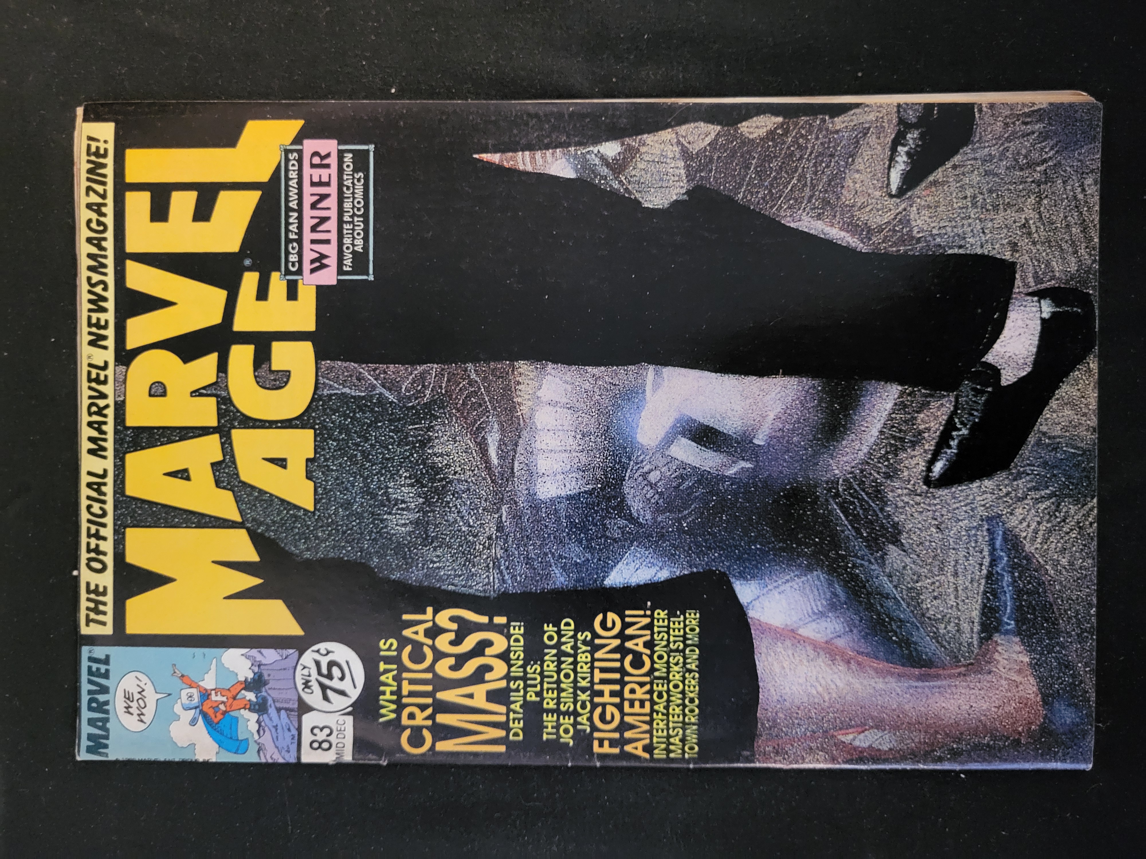 BID PER WHAT YOU SEE IN THE PHOTO, NOT THE AI GENERATED TITLES AND DESCRIPTIONS! Marvel Age Issue 83, published by Marvel Comics in 1989 and dated mid-December. This Copper Age newsmagazine features a yellow masthead and stylized, textured cover art depicting a figure’s lower legs and feet. The cover includes promotional text for Critical Mass and Fighting American, along with a CBG Fan Awards Winner badge. The original publication price is listed as 75 cents. The publication is a stapled newsmagazine.