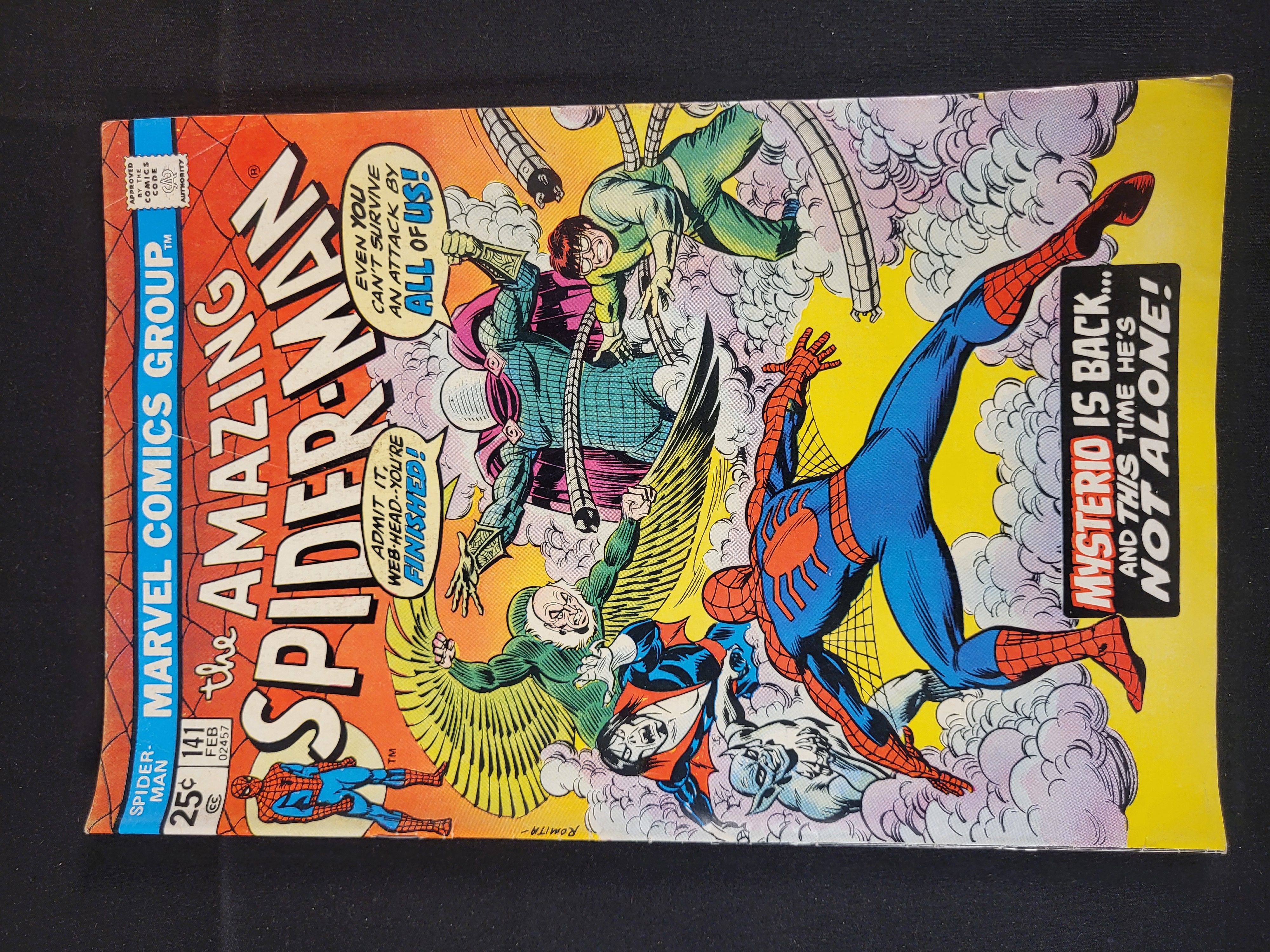 BID PER WHAT YOU SEE IN THE PHOTO, NOT THE AI GENERATED TITLES AND DESCRIPTIONS! A vintage comic book, The Amazing Spider-Man issue number 141, published by Marvel Comics Group with a cover date of February 1975. The cover art is signed by Romita and depicts Spider-Man in combat with several antagonists, including Mysterio, Doctor Octopus, and the Vulture. This issue is identified as the first appearance of the second Mysterio, Francis Berkhart. The front cover features the series masthead, a 25 cent price point, the Comics Code Authority seal, and various promotional text and dialogue bubbles. The item is a standard format comic book from the Bronze Age of comics.