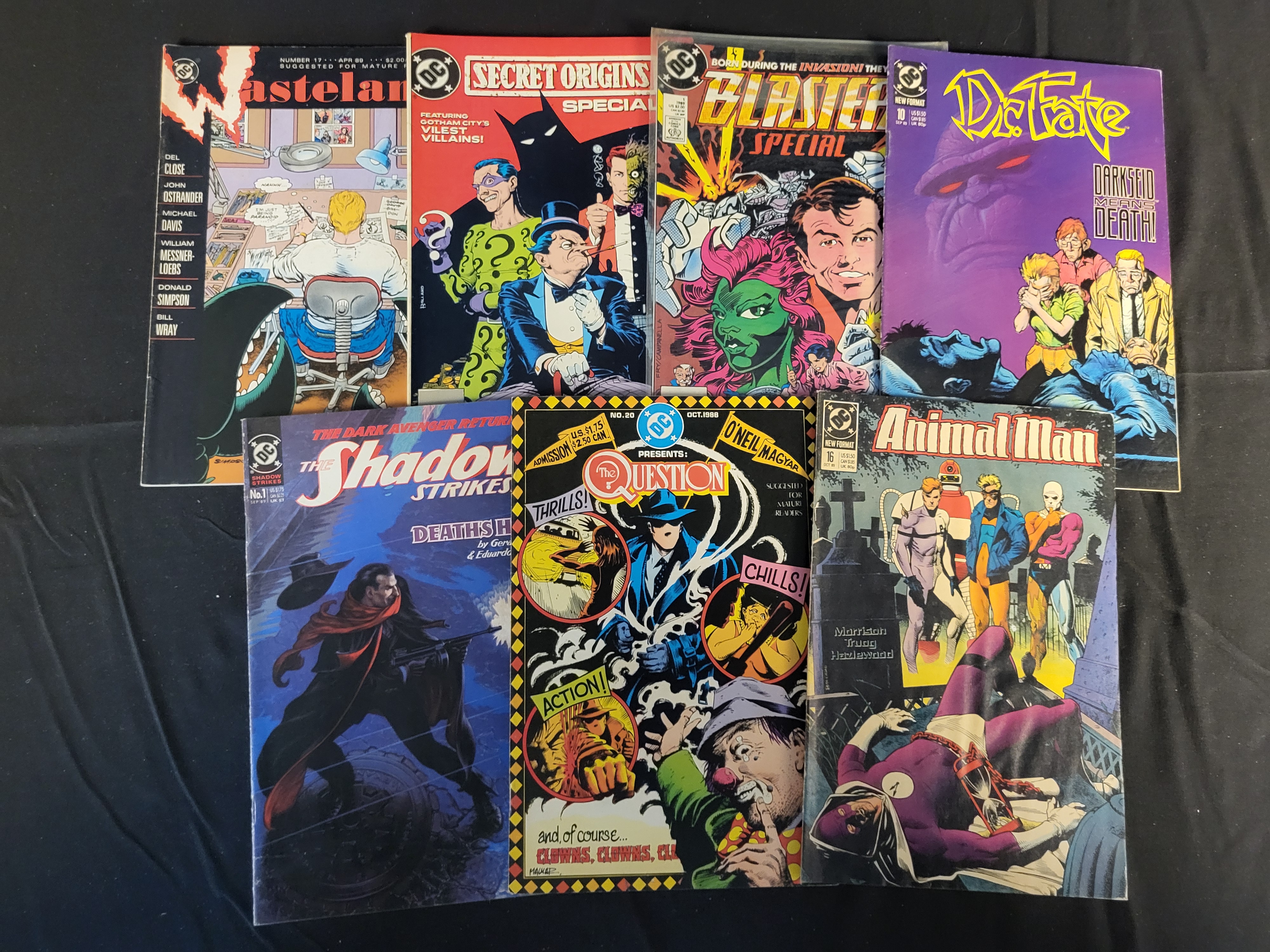 BID PER WHAT YOU SEE IN THE PHOTO, NOT THE AI GENERATED TITLES AND DESCRIPTIONS! A collection of DC Comics published during the late 1980s. The group includes various titles such as Wasteland No. 17 (1989), Secret Origins Special No. 1 (1989) featuring Batman’s rogues gallery, Blasters Special No. 1 (1989), Dr. Fate No. 10 (1989), The Shadow Strikes No. 1 (1989), The Question No. 20 (1988), and Animal Man No. 16 (1989). These comics are printed in color on paper and feature cover art by industry professionals including Grant Morrison and Denys Cowan. Each issue displays standard DC publisher logos, issue numbers, monthly publication dates, and original cover prices.