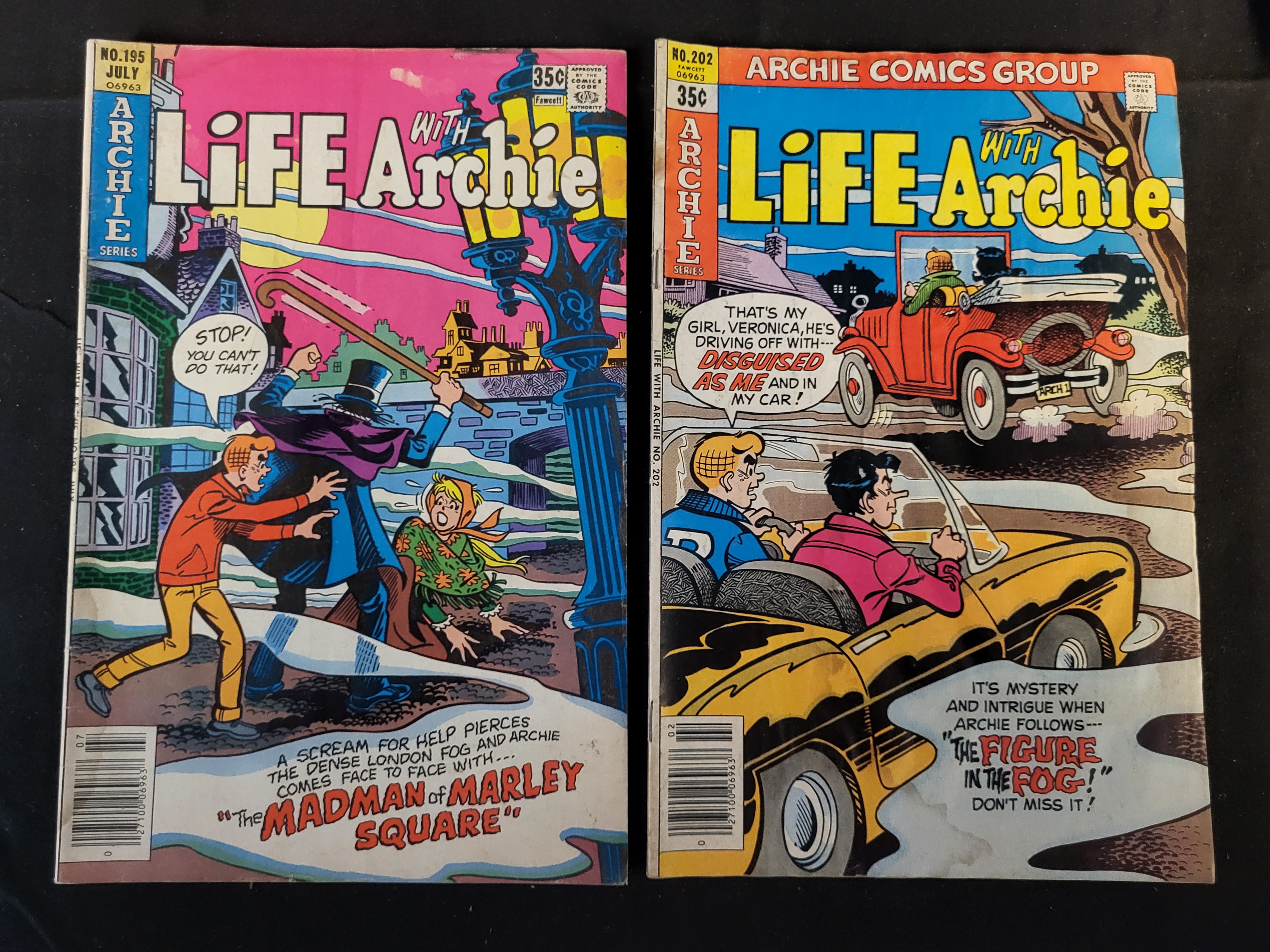 BID PER WHAT YOU SEE IN THE PHOTO, NOT THE AI GENERATED TITLES AND DESCRIPTIONS! This lot consists of two vintage comic books from the Life with Archie series, published by the Archie Comics Group and Fawcett. The pair includes issue No. 195, dated July, and issue No. 202, dated February 1979. Both publications feature a 35-cent cover price and the Comics Code Authority seal. Issue 195 depicts a mystery-themed story titled The Madman of Marley Square, while issue 202 presents The Figure in the Fog! featuring classic Archie characters and automotive illustrations. The items are constructed of printed paper with full-color covers and standard newsprint interior pages. Both issues include printed UPC barcodes on the lower left of the front covers.