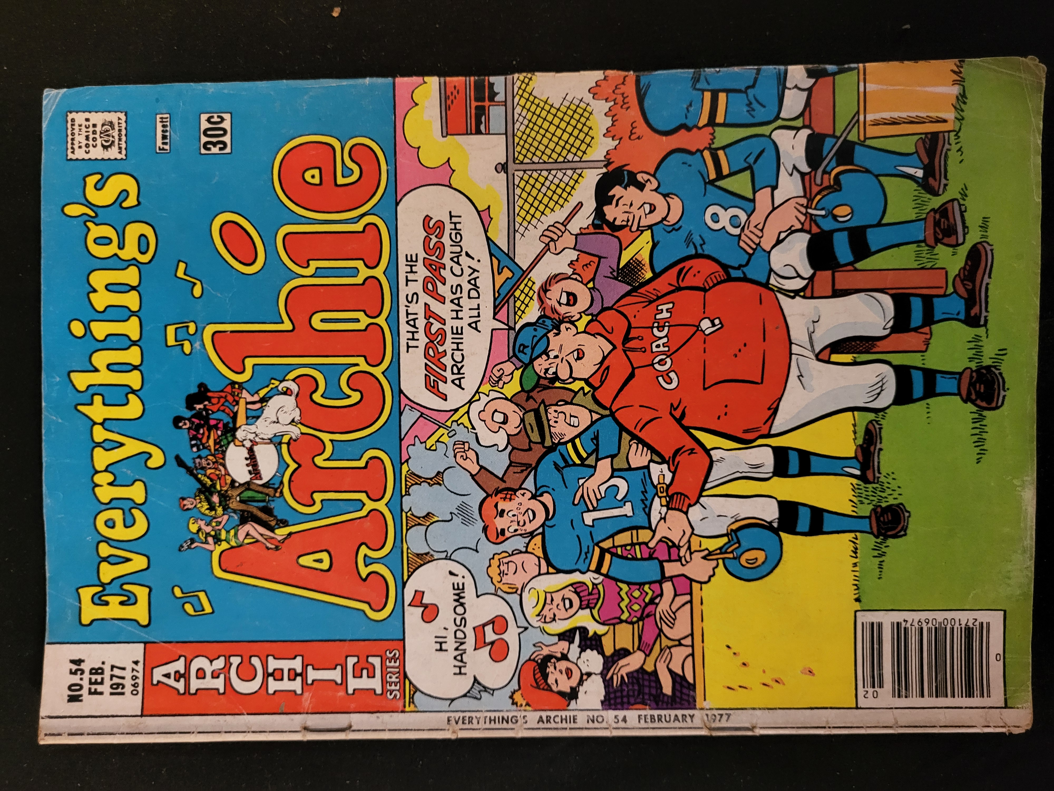 BID PER WHAT YOU SEE IN THE PHOTO, NOT THE AI GENERATED TITLES AND DESCRIPTIONS! A vintage comic book titled Everything’s Archie, issue No. 54, dated February 1977, published as part of the Archie Series (1969 series). The cover features a color illustration of Archie Andrews in a football uniform with teammates, a coach, and Betty Cooper. The front cover displays a printed price of 30 cents, the Approved by the Comics Code Authority seal, and a standard UPC barcode.