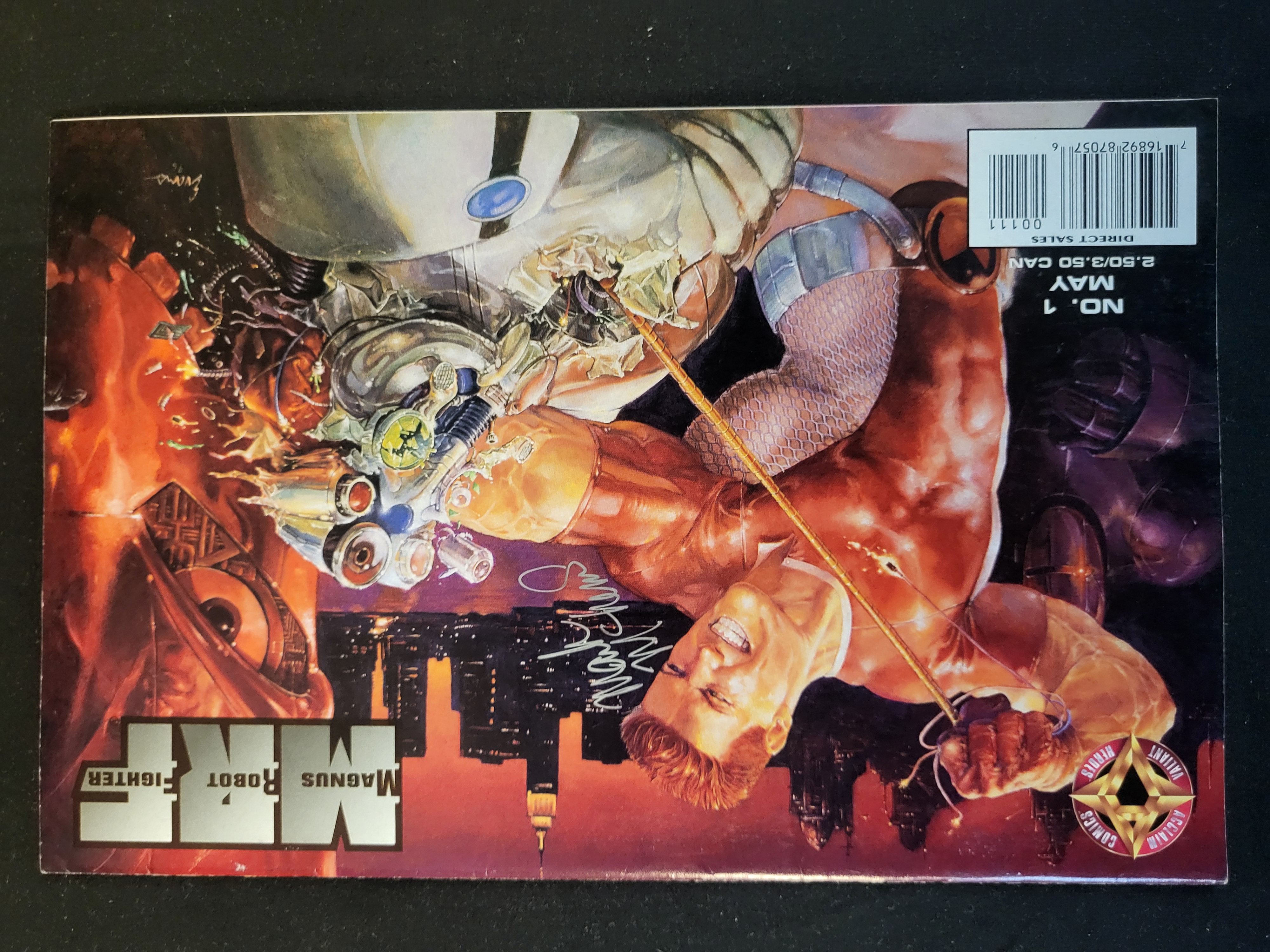 BID PER WHAT YOU SEE IN THE PHOTO, NOT THE AI GENERATED TITLES AND DESCRIPTIONS! This lot consists of a single comic book, Magnus Robot Fighter issue number 1, published by Acclaim Comics under the Valiant Heroes line, dated May 1997. The front cover features a painted-style illustration of the titular character engaged in combat with a mechanical entity, with the artist signature Evans 96 appearing in the print. The cover displays the series title MRF in a stylized metallic font, a barcode, and a price of $2.50 US ($3.50 CAN). An unverified signature in silver-toned ink is present over the central artwork. The Acclaim and Valiant publisher logos are located in the lower right corner.