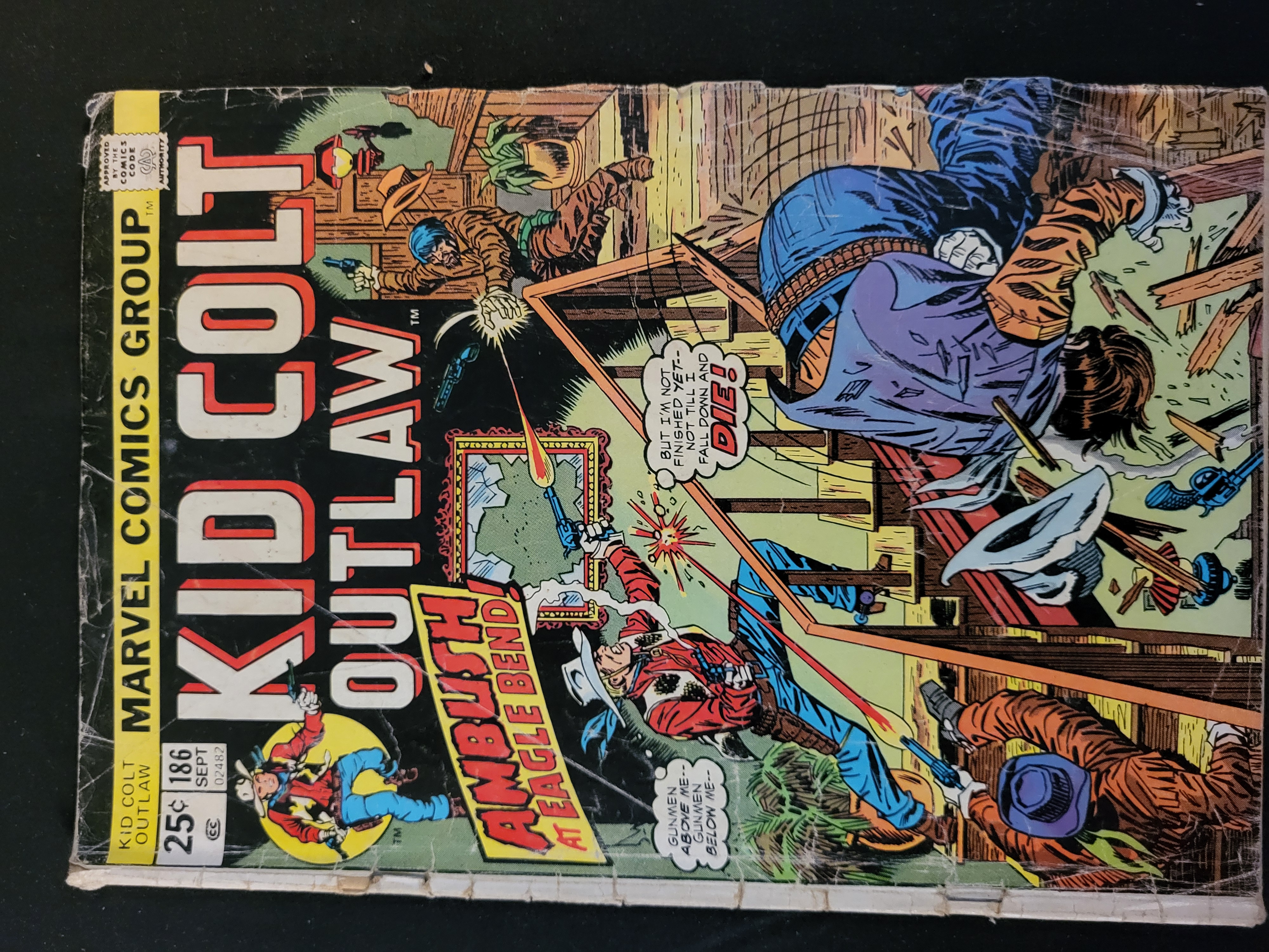 BID PER WHAT YOU SEE IN THE PHOTO, NOT THE AI GENERATED TITLES AND DESCRIPTIONS! A Marvel Comics Group comic book titled Kid Colt Outlaw, issue number 186, dated September 1974. The front cover illustrates a Western shootout scene titled Ambush at Eagle Bend! and features the Comics Code Authority seal alongside an original 25-cent price point. The publication is constructed of standard comic book paper stock with a color-printed cover.