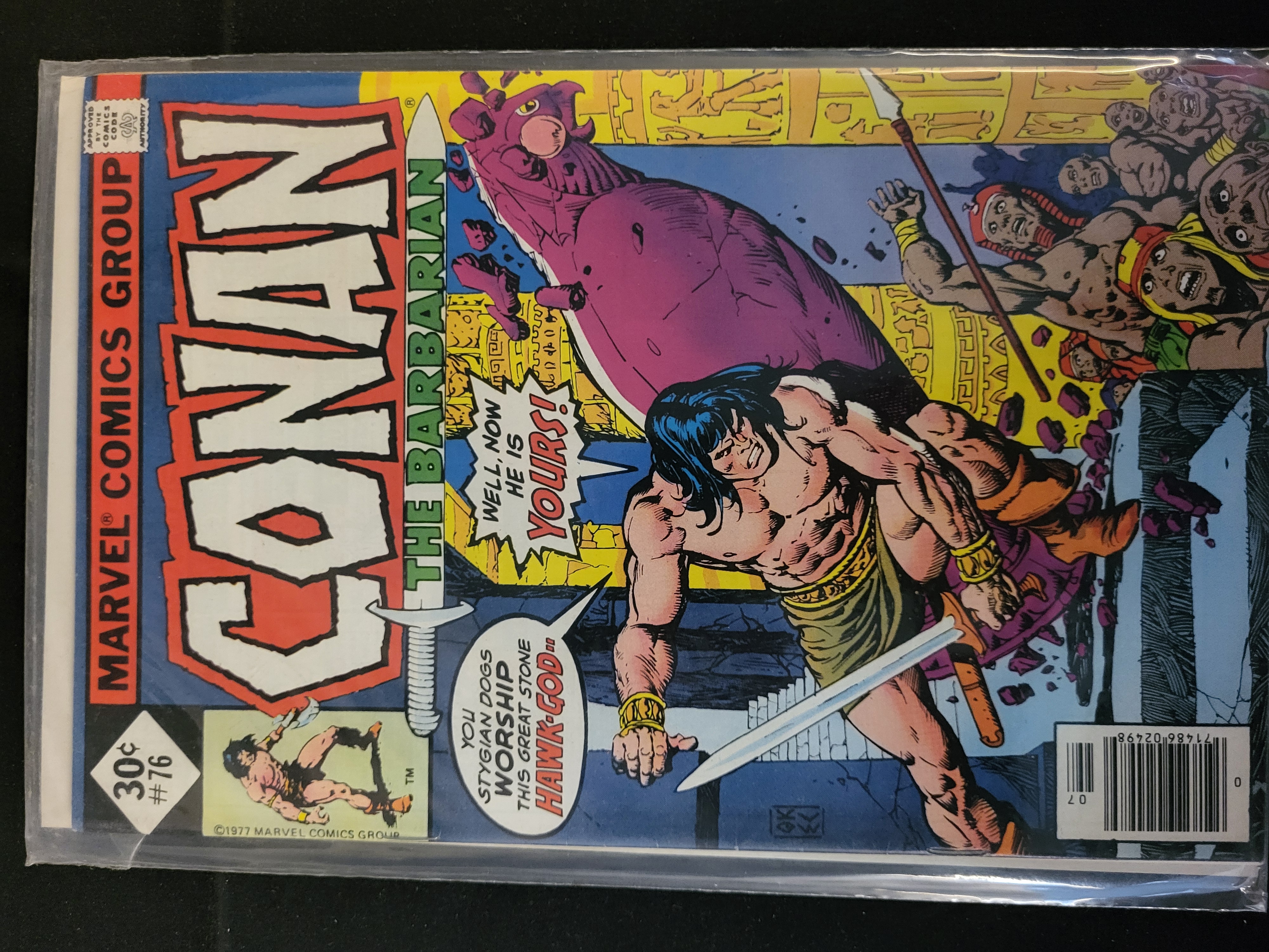 BID PER WHAT YOU SEE IN THE PHOTO, NOT THE AI GENERATED TITLES AND DESCRIPTIONS! Conan the Barbarian #76, published by Marvel Comics Group in July 1977. This newsstand edition features a barcode on the front cover. The cover art depicts Conan with a sword, a large purple hawk statue, and several other figures. The front cover displays the Conan the Barbarian logo, a 30-cent price point, the Comics Code Authority seal, and a copyright date of 1977. The item is a staple-bound comic book printed on paper.