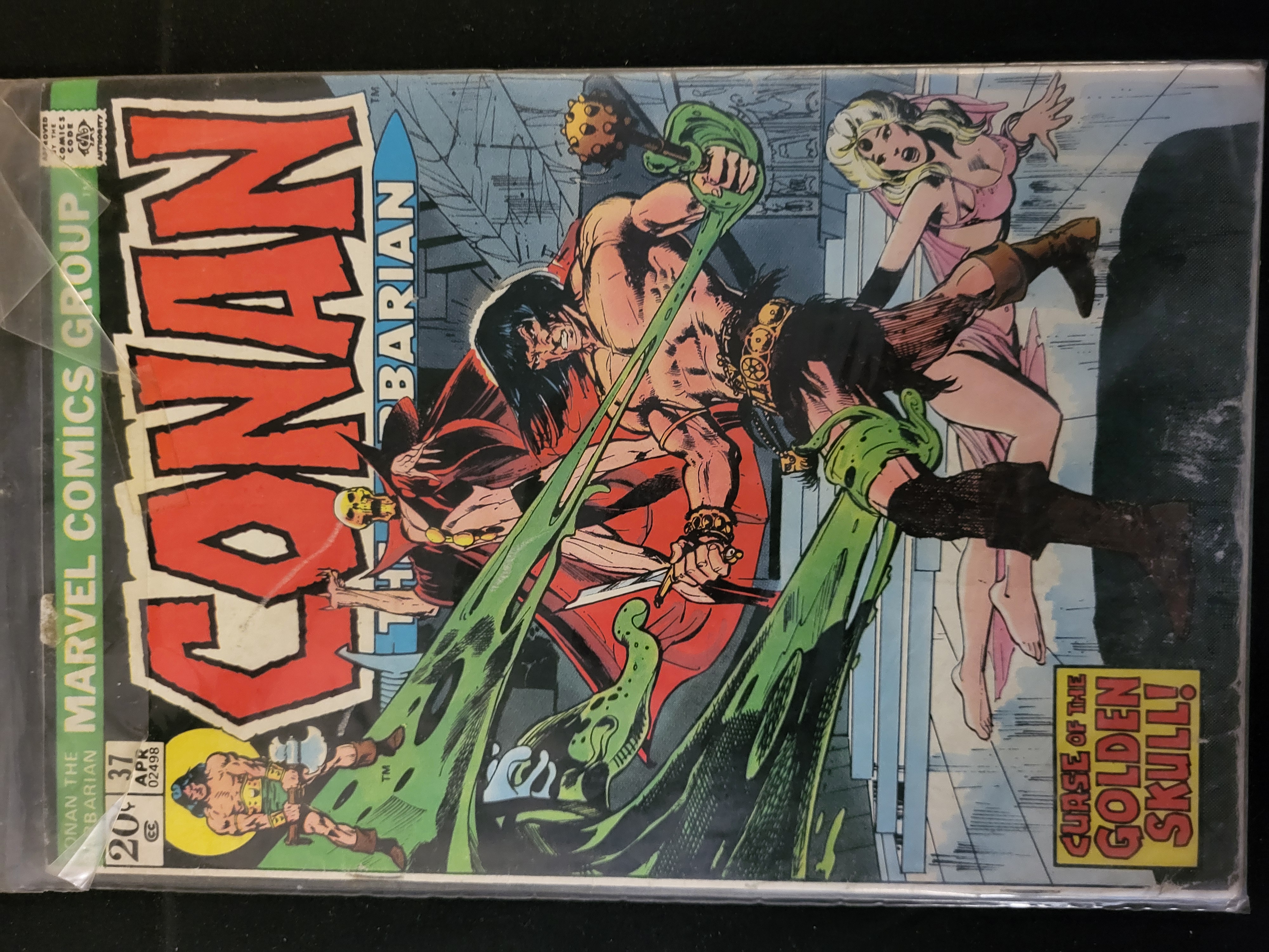 BID PER WHAT YOU SEE IN THE PHOTO, NOT THE AI GENERATED TITLES AND DESCRIPTIONS! This is an original comic book, Conan the Barbarian No. 37, published by Marvel Comics Group in April 1974. The issue features the story titled Curse of the Golden Skull! with cover art by Neal Adams. The front cover includes the Marvel Comics Group vertical banner, the series title logo, a 20-cent price point, and the Comics Code Authority seal. The cover illustration depicts the character Conan engaged in battle with a skeletal figure and a green multi-limbed creature. The publication is a standard format comic book with a color cover and newsprint interior pages.