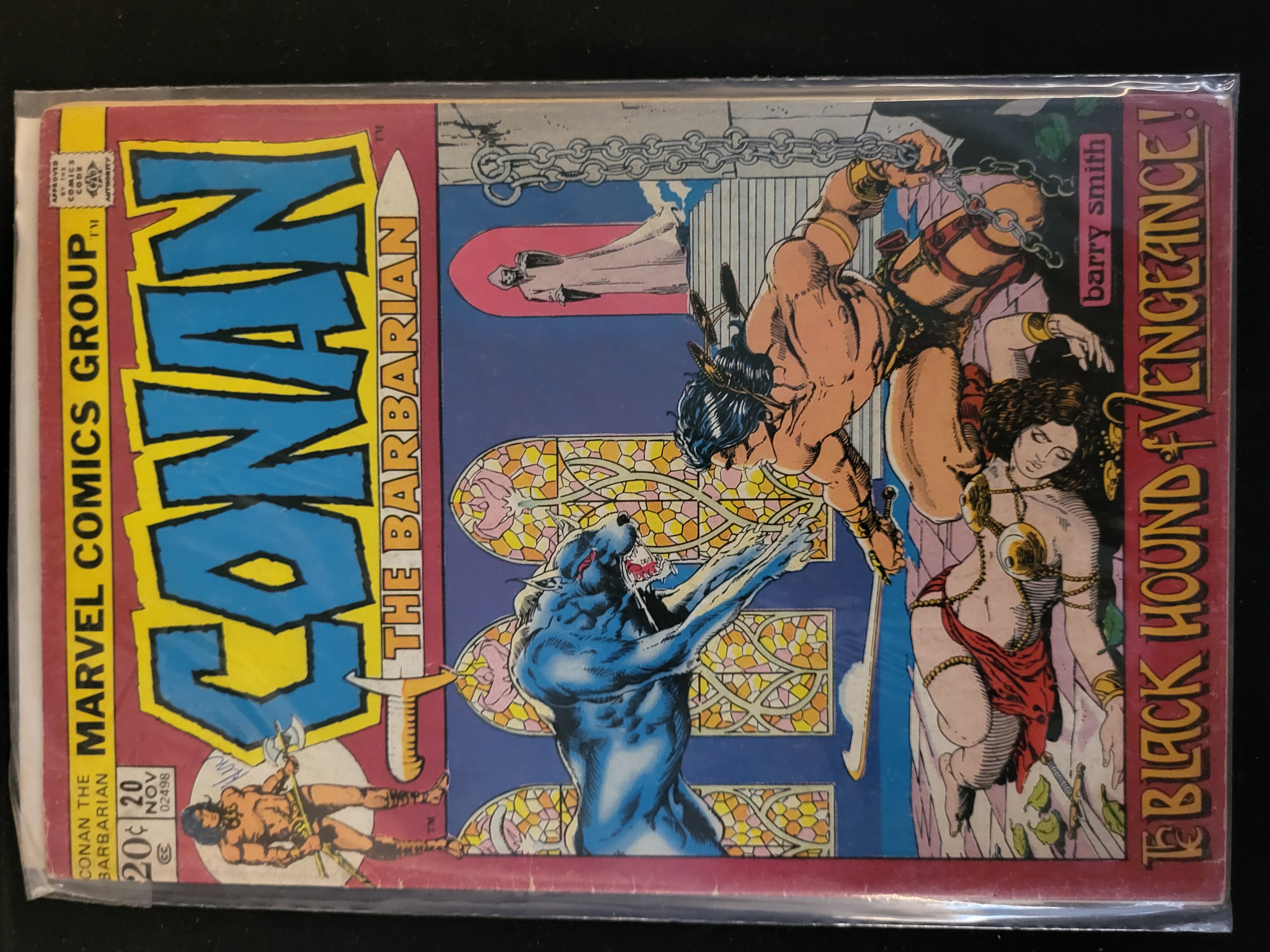 BID PER WHAT YOU SEE IN THE PHOTO, NOT THE AI GENERATED TITLES AND DESCRIPTIONS! A vintage copy of Conan the Barbarian issue number 20, published by Marvel Comics Group and dated November 1972. The cover features artwork by Barry Windsor-Smith, credited as Barry Smith, for the story titled The Black Hound of Vengeance. The illustration depicts the character Conan in combat with a large blue creature while a woman is shown in chains nearby. The front cover displays the Marvel Comics Group branding, a 20 cent price point, and the Approved by the Comics Code Authority seal. This is a staple-bound comic book printed on paper.