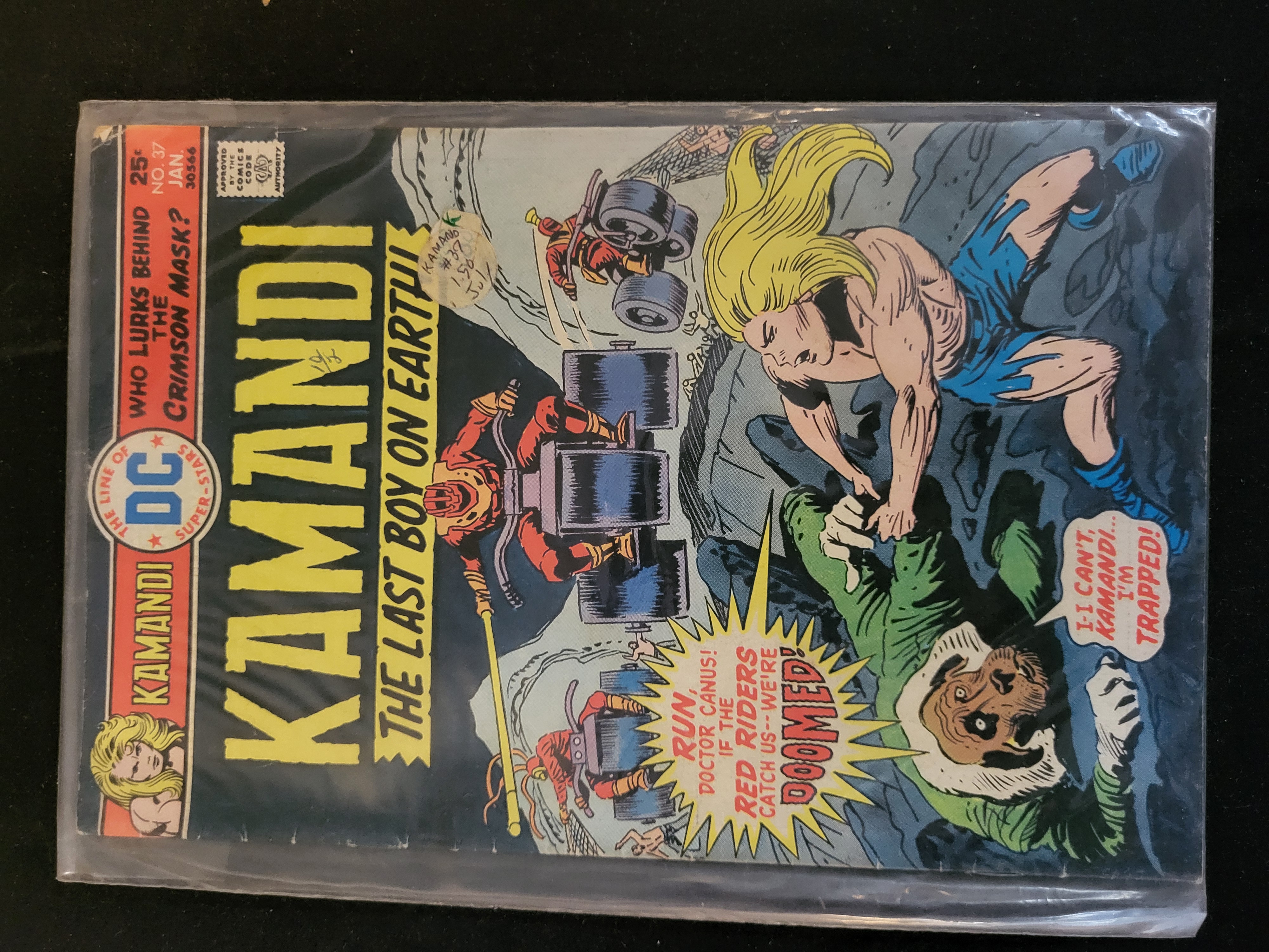 BID PER WHAT YOU SEE IN THE PHOTO, NOT THE AI GENERATED TITLES AND DESCRIPTIONS! This Bronze Age comic book is Kamandi: The Last Boy on Earth, issue number 37, published by DC Comics with a cover date of January 1976. The cover art features the protagonist and an anthropomorphic companion in a pursuit scene involving characters identified as Red Riders. The publication displays the DC Super-Stars logo, the original 25-cent retail price, and the Comics Code Authority seal. The cover includes the promotional text Who lurks behind the Crimson Mask? along with character dialogue. The item is presented in a clear protective sleeve.