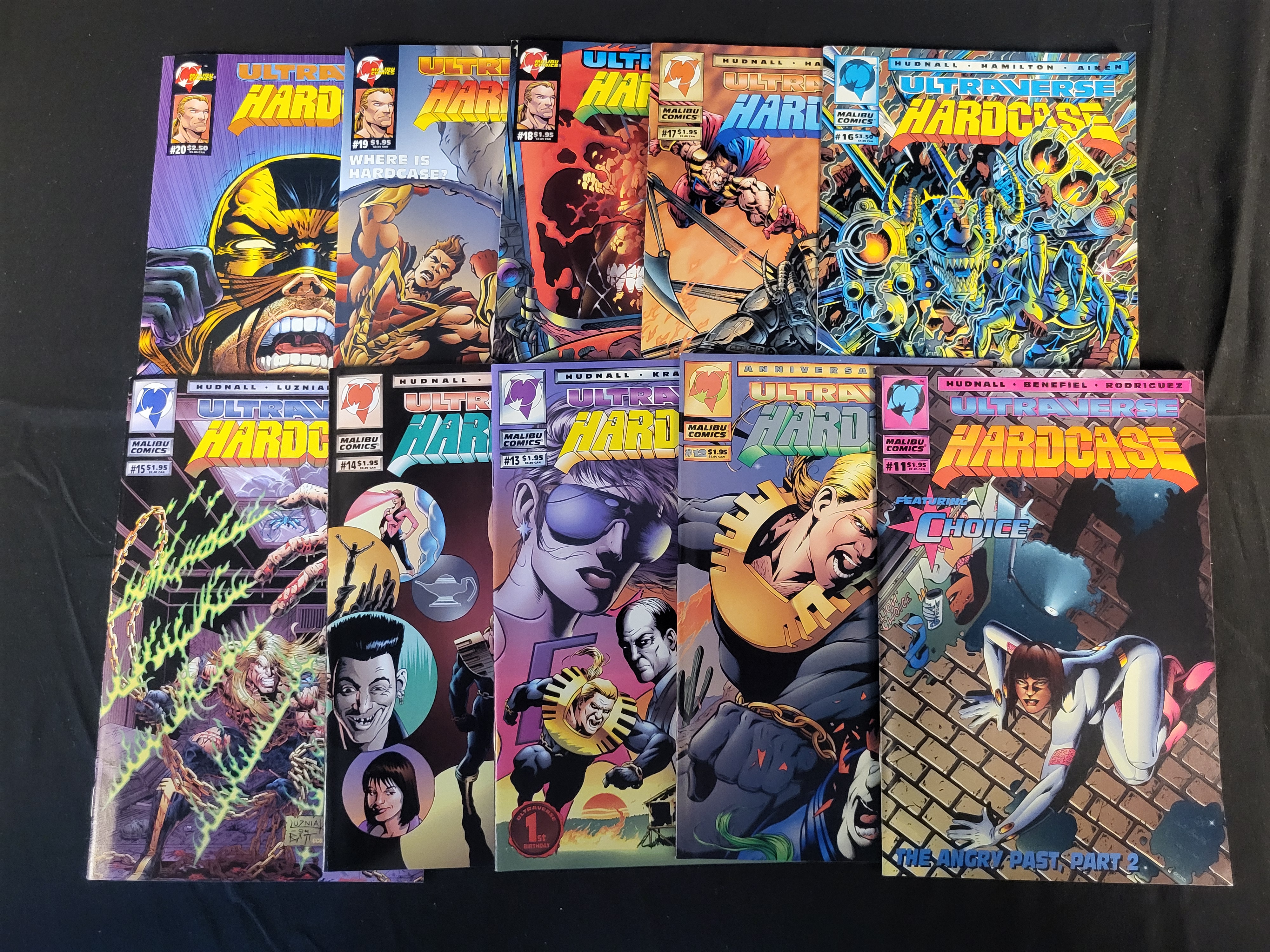 BID PER WHAT YOU SEE IN THE PHOTO, NOT THE AI GENERATED TITLES AND DESCRIPTIONS! A collection of sequential comic books from the Hardcase series, part of the Ultraverse line published by Malibu Comics. This group includes issues numbered 11 through 20, dating from the mid-1990s. The publications feature contributions from creators such as James D. Hudnall, Hamilton, and Aiken. Each issue is a standard-format comic book featuring color illustrations and original cover prices. The covers display various action-oriented graphics and character art associated with the series.