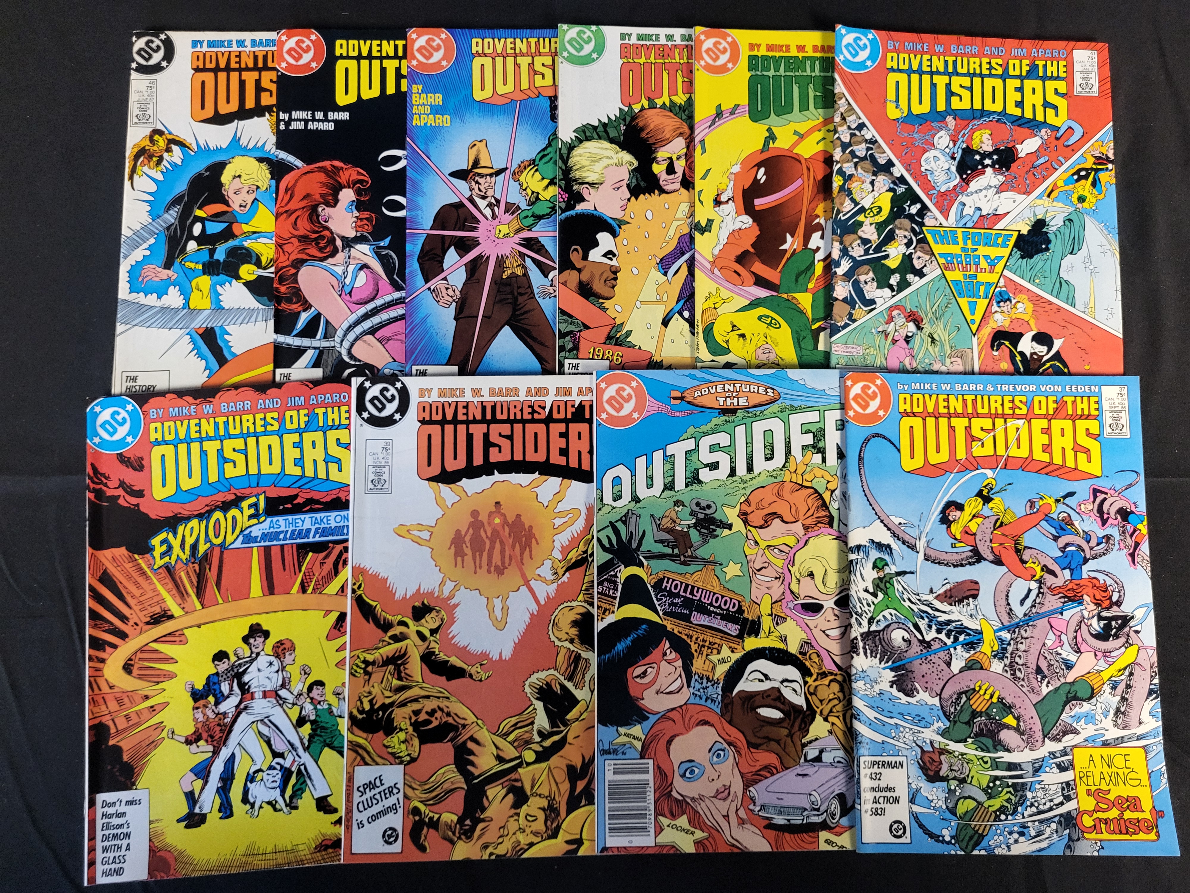 BID PER WHAT YOU SEE IN THE PHOTO, NOT THE AI GENERATED TITLES AND DESCRIPTIONS! A group of Adventures of the Outsiders comic books published by DC Comics during the mid-1980s. This collection of Copper Age comics features stories written by Mike W. Barr with interior and cover art by Jim Aparo and Trevor Von Eeden. The issues include full-color cover illustrations and feature various characters from the Outsiders team. Visible issue numbers include 37, 39, 41, and 46. The group contains both Direct Market and Newsstand editions.