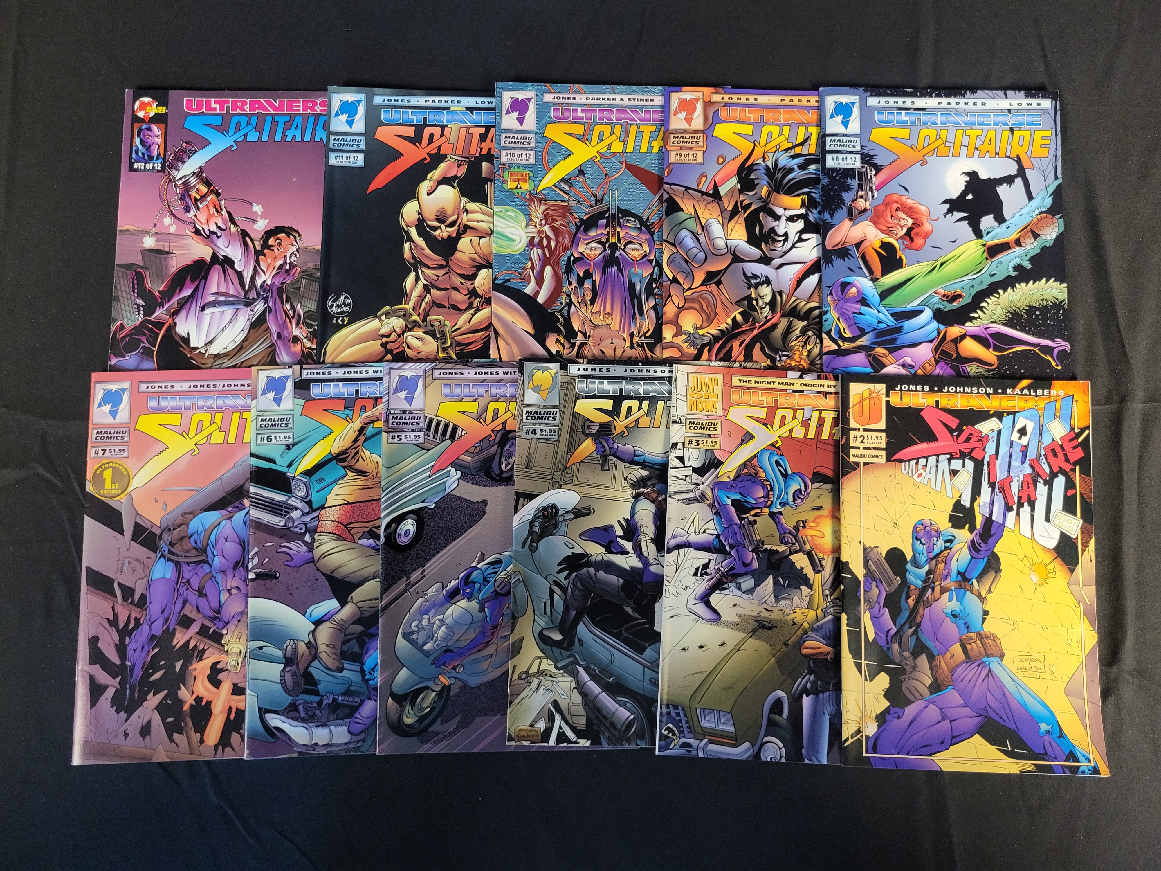 BID PER WHAT YOU SEE IN THE PHOTO, NOT THE AI GENERATED TITLES AND DESCRIPTIONS! A collection of vintage American comic books from the Malibu Comics Ultraverse Solitaire series, dating to the early 1990s. The group includes sequential issues featuring full-color cover art by creators including Jones, Johnson, Kaalberg, and Parker. Specific issues display promotional markings such as a 1st Birthday commemorative emblem and tie-ins to other series including The Night Man. The lot consists of multiple issues from the series run, including issue numbers 2 through 12.
