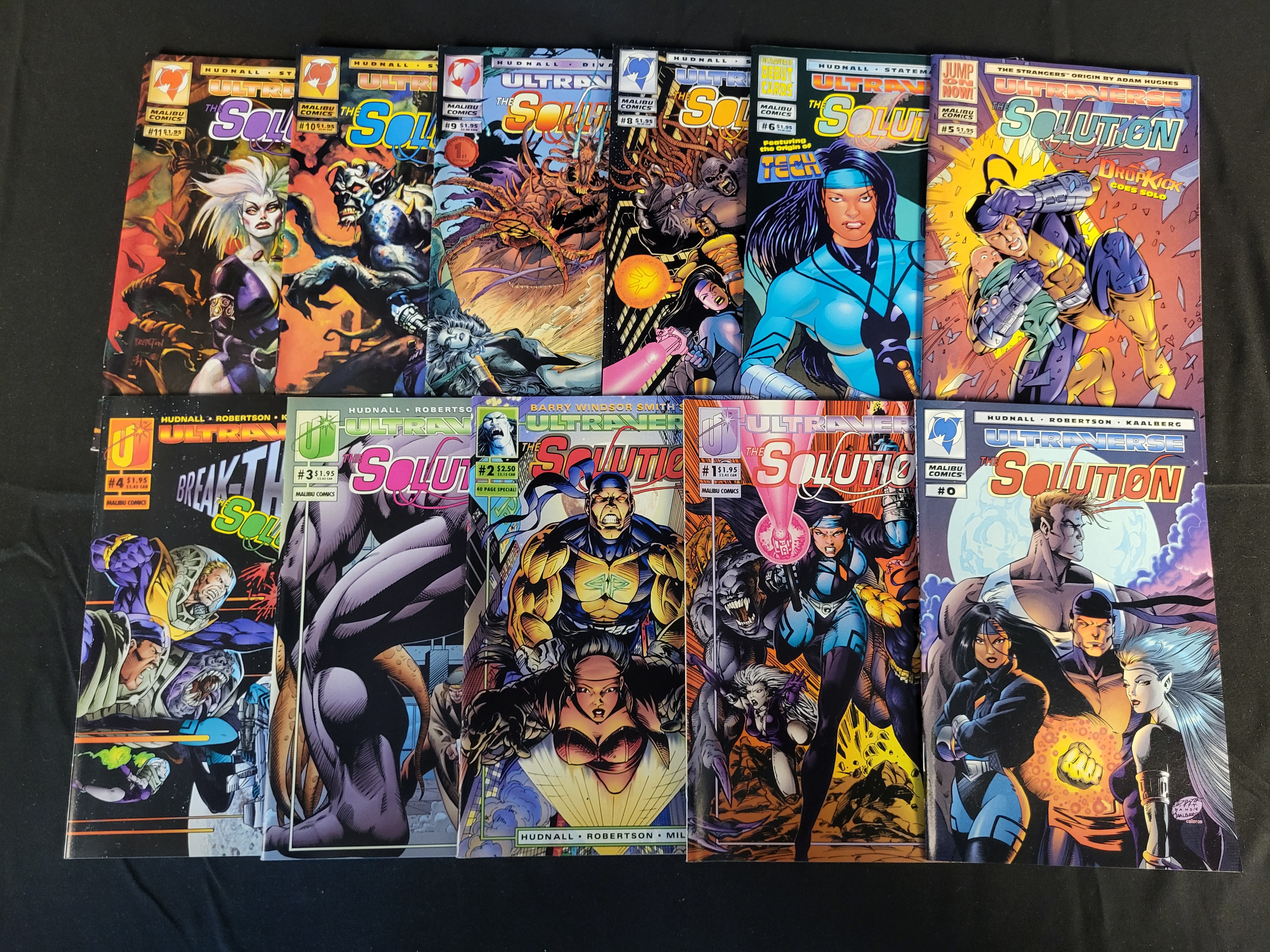 BID PER WHAT YOU SEE IN THE PHOTO, NOT THE AI GENERATED TITLES AND DESCRIPTIONS! A collection of vintage comic books from the Malibu Comics Ultraverse line featuring the title The Solution. Published in the early 1990s, these issues feature credits for creators including James Hudnall and Darick Robertson. The group includes issues numbered 0, 1, 2, 3, 4, 5, 6, 8, 9, 10, and 11. Each book consists of a full-color printed cover and interior pages with standard saddle-stitched binding. The cover art depicts various characters and graphic elements associated with the series.