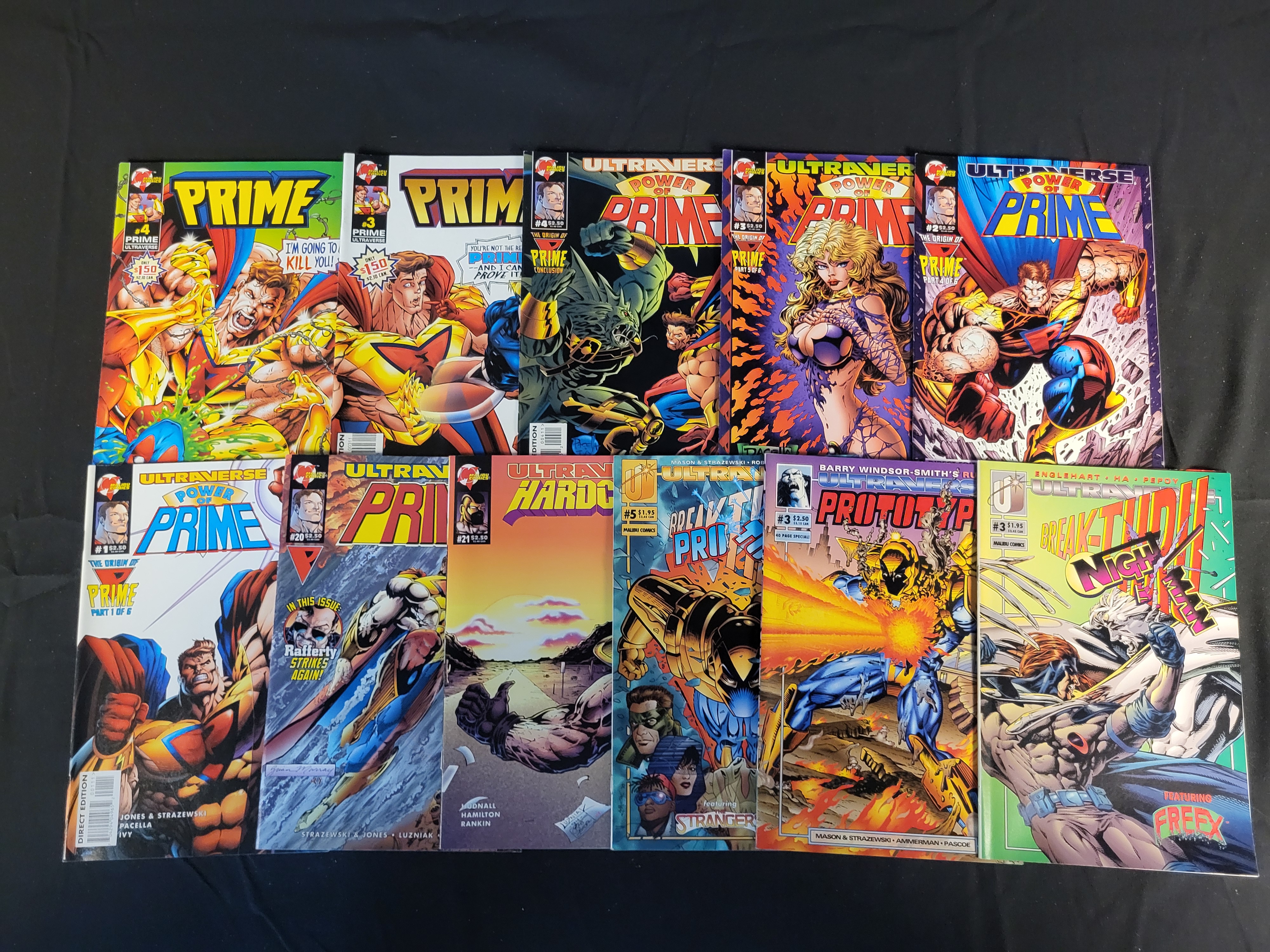 BID PER WHAT YOU SEE IN THE PHOTO, NOT THE AI GENERATED TITLES AND DESCRIPTIONS! A collection of comic books from the Malibu Comics Ultraverse line, dating to the early 1990s. The group features titles such as Prime, Power of Prime, Hardcase, Prototype, and Break-Thru. Visible issue numbers include 1, 2, 3, 4, 5, 20, and 21. Each issue is printed on standard gloss-coated paper and showcases dynamic superhero cover art characteristic of the era. Notable credits visible on the covers include writers and artists such as Gerard Jones, Len Strazewski, Barry Windsor-Smith, and Norm Breyfogle.