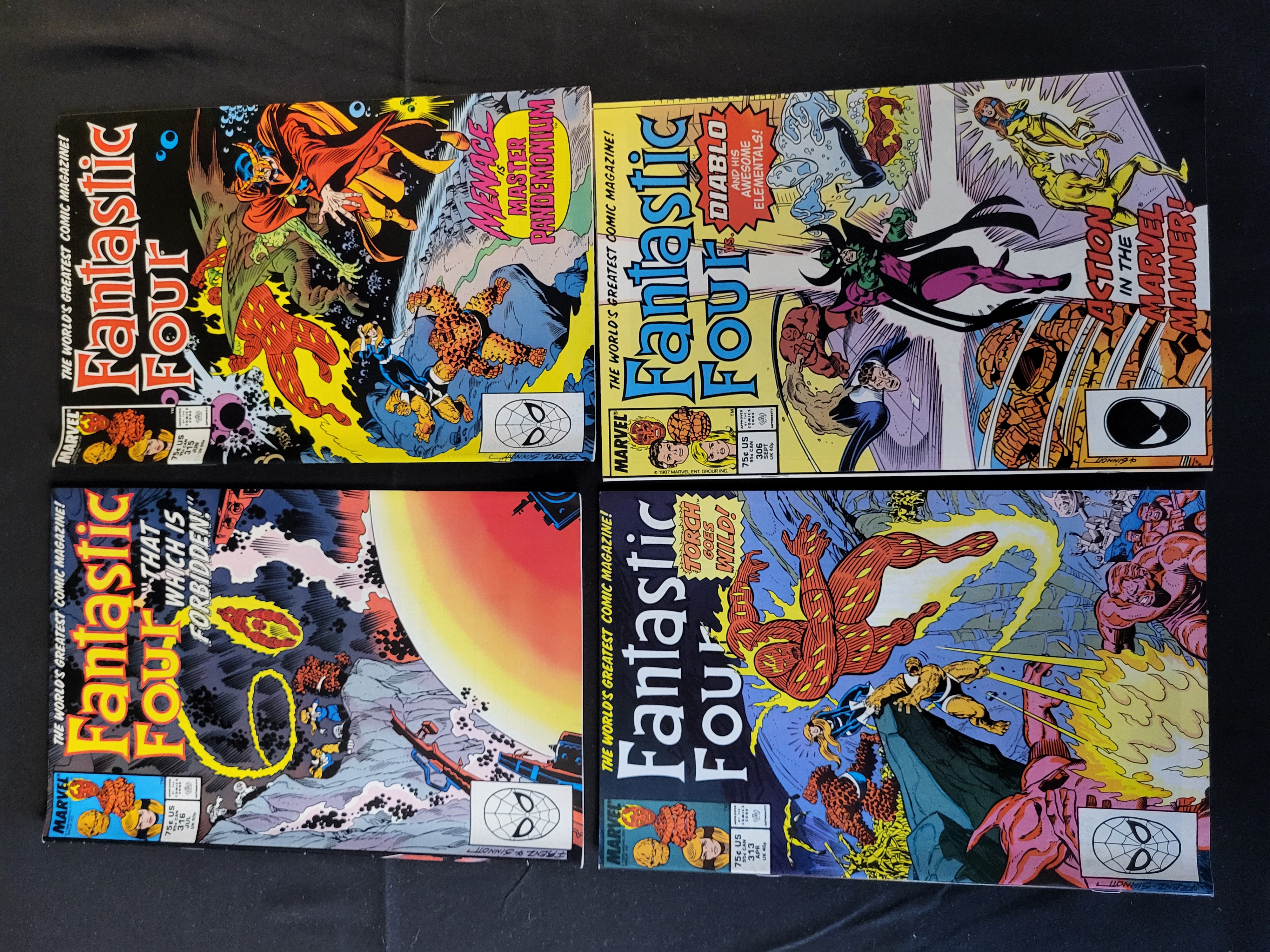 BID PER WHAT YOU SEE IN THE PHOTO, NOT THE AI GENERATED TITLES AND DESCRIPTIONS! A collection of Marvel Comics Fantastic Four series comic books dating to the late 1980s. The group includes issues such as #306, #313, #315, and #316. Each issue displays the masthead The World’s Greatest Comic Magazine! alongside the Marvel Comics logo. The cover illustrations include storylines such as Diablo and his Awesome Elementals!, Torch Goes Wild!, Menace: Master Pandemonium, and That Which Is Forbidden!. These publications are printed on paper with staple-bound spines and multi-color cover art.