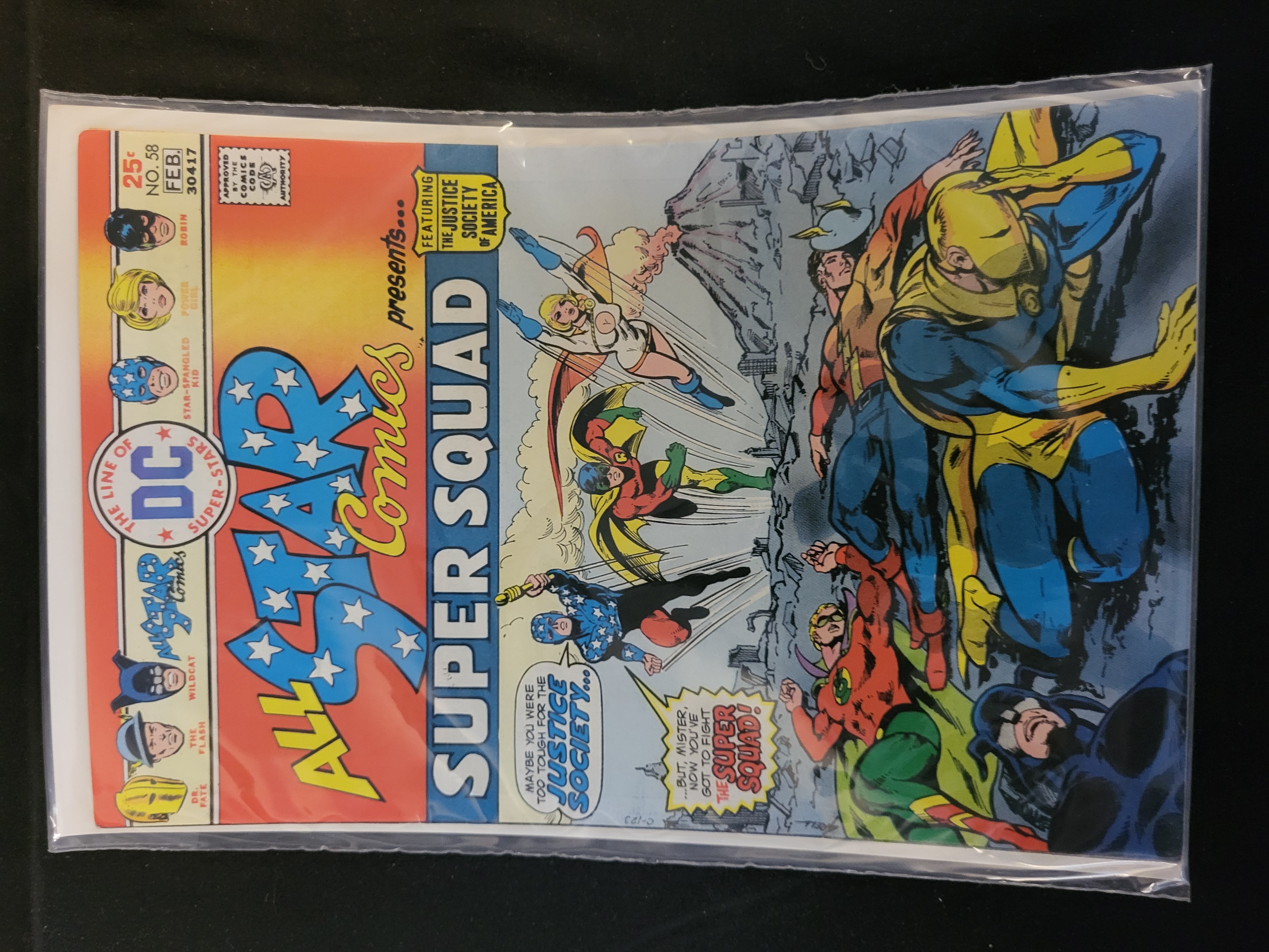 BID PER WHAT YOU SEE IN THE PHOTO, NOT THE AI GENERATED TITLES AND DESCRIPTIONS! All-Star Comics #58, published by DC Comics with a cover date of February 1976. This issue is identified by web consensus as the first appearance of the character Power Girl (Kara Zor-L). The cover features the Super Squad and the Justice Society of America, with depictions of Power Girl, Robin, the Star-Spangled Kid, Wildcat, The Flash, and Dr. Fate. The front cover includes a 25-cent price, the issue number 58, and the Comics Code Authority seal. A vertical banner on the left side contains character portrait icons. The comic is a single issue printed on standard newsprint with a color-printed cover.