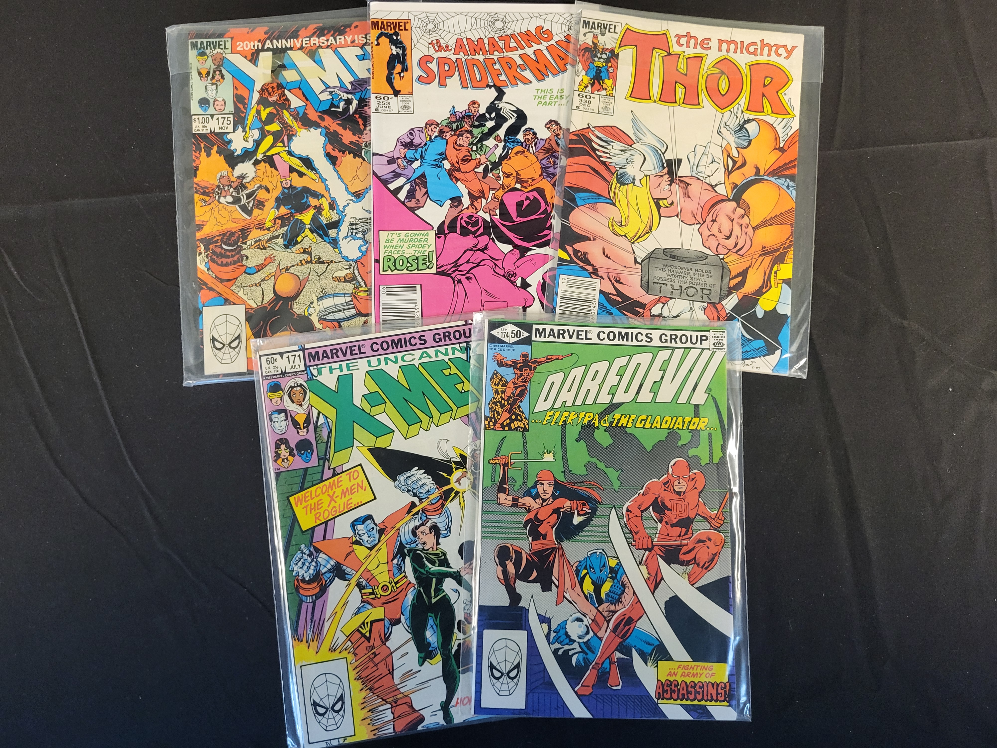 BID PER WHAT YOU SEE IN THE PHOTO, NOT THE AI GENERATED TITLES AND DESCRIPTIONS! A collection of vintage Marvel Comics Group comic books dating from the early 1980s. The group includes The Uncanny X-Men issue 171 featuring the first appearance of Rogue and issue 175, the 20th Anniversary issue. Also included are The Amazing Spider-Man issue 253, The Mighty Thor issue 338, and Daredevil issue 174. Each comic is staple-bound with color-printed covers and is individually housed in a clear protective plastic sleeve.