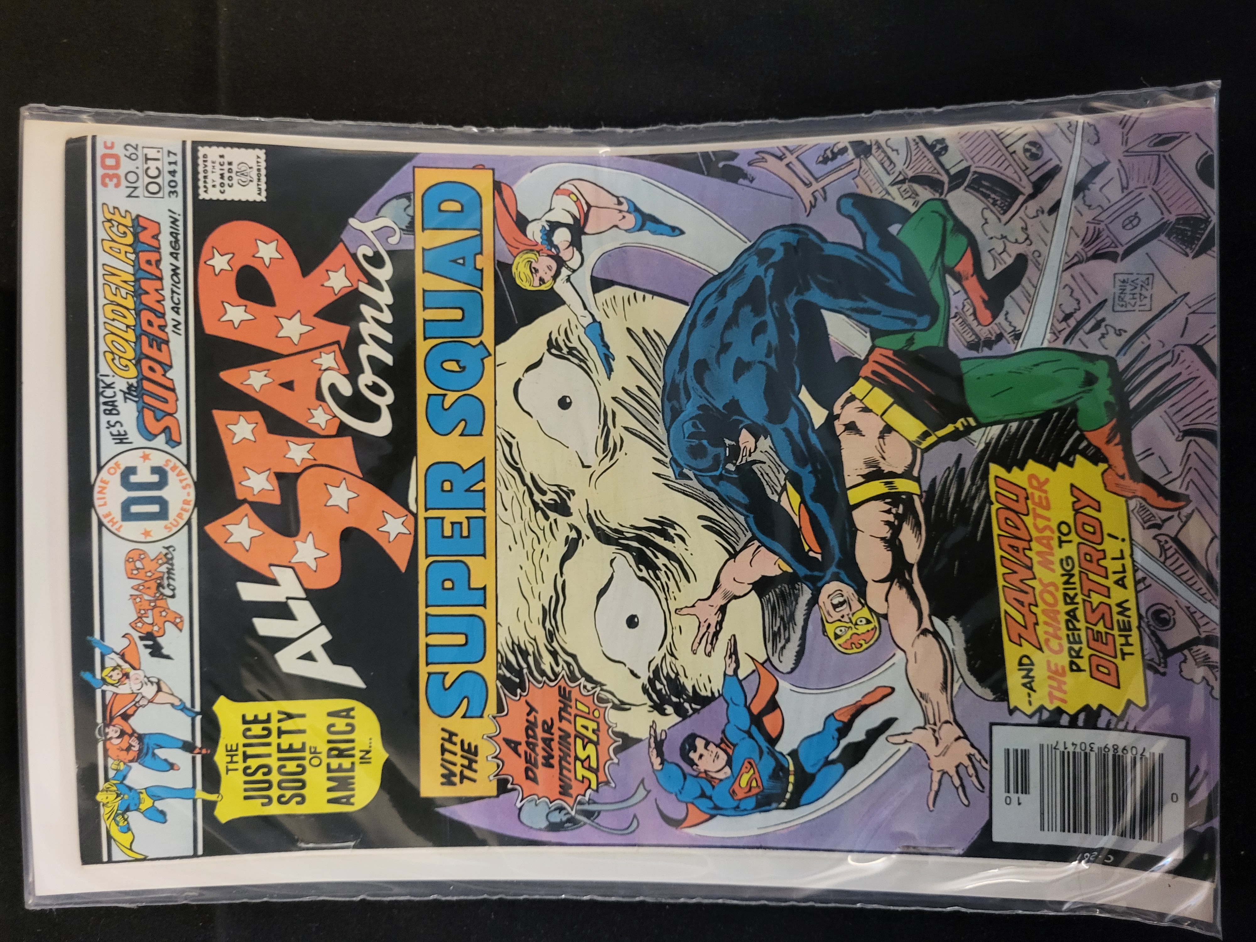 BID PER WHAT YOU SEE IN THE PHOTO, NOT THE AI GENERATED TITLES AND DESCRIPTIONS! A vintage Bronze Age comic book, All Star Comics No. 62, published by DC Comics with an October 1976 cover date. The cover features the Justice Society of America (JSA) and The Super Squad, specifically highlighting the return of the Golden Age Superman. The cover art, credited to Ernie Chua, depicts characters including Power Girl, Wildcat, and Superman. The issue features a 30-cent cover price and includes the Comics Code Authority seal and a UPC barcode. The publication is housed in a clear protective plastic sleeve.