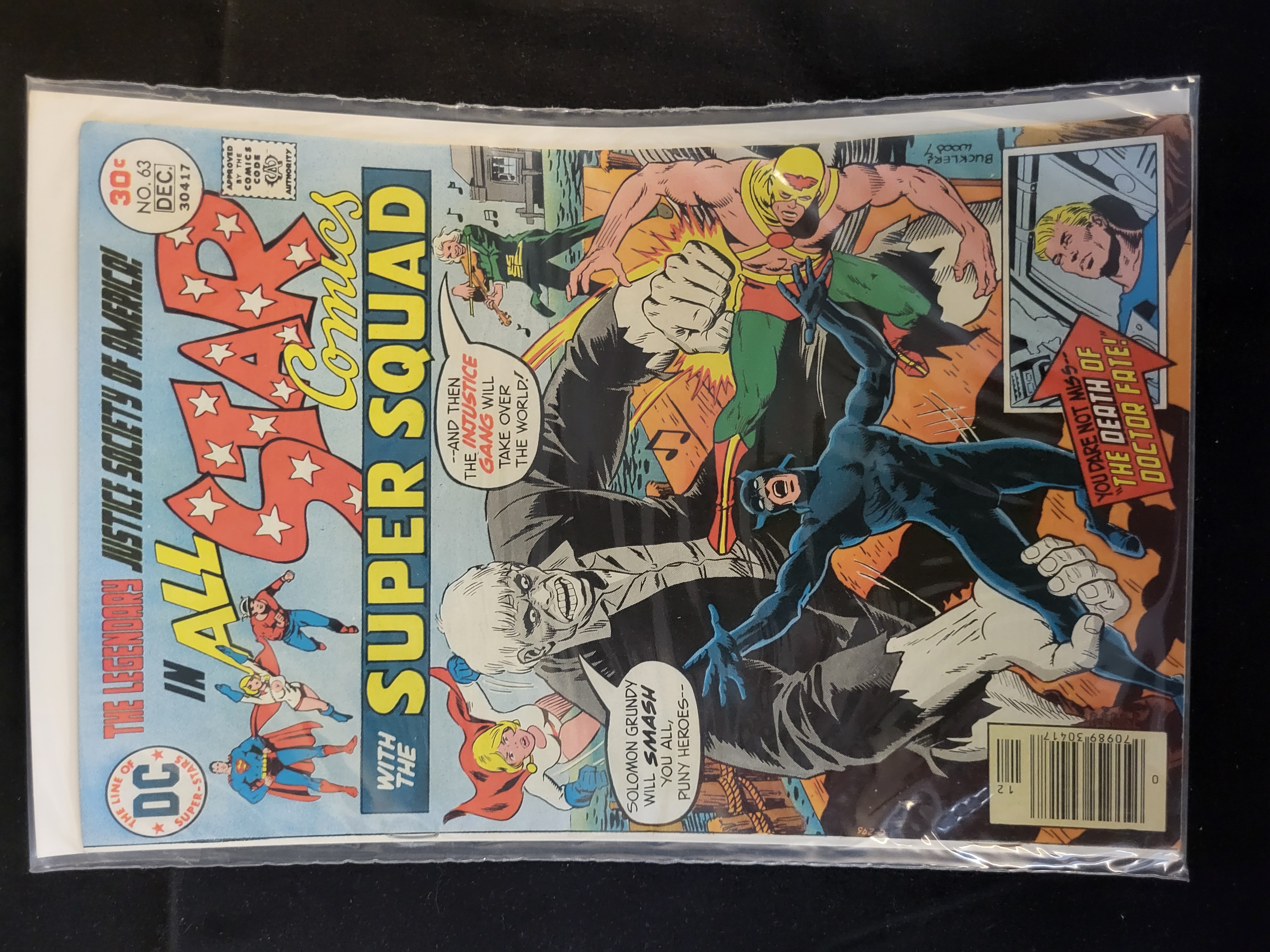 BID PER WHAT YOU SEE IN THE PHOTO, NOT THE AI GENERATED TITLES AND DESCRIPTIONS! This is a single issue of All Star Comics number 63, published by DC Comics and dated December 1976. The Bronze Age comic features the Justice Society of America and the Super Squad. The cover art, credited to Buckler and Wood, depicts the character Solomon Grundy in combat with Wildcat, Hourman, and Power Girl, alongside a headline promoting The Death of Doctor Fate. The front cover displays a 30-cent price point, the circular DC logo, and the Comics Code Authority seal. The item is housed in a clear plastic protective sleeve.