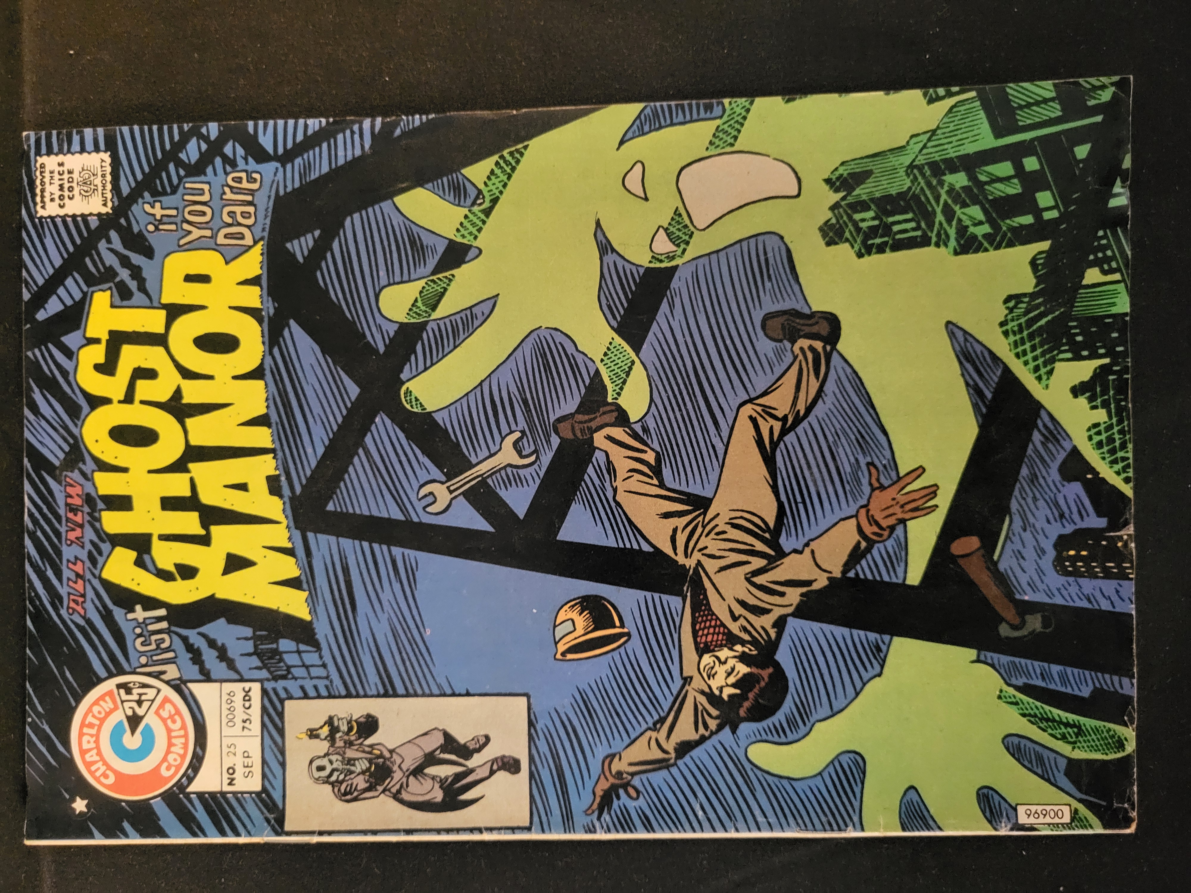 BID PER WHAT YOU SEE IN THE PHOTO, NOT THE AI GENERATED TITLES AND DESCRIPTIONS! This comic book is Ghost Manor issue number 25, part of the second series published by Charlton Comics in September 1975. The cover illustration depicts a construction worker falling from a steel high-rise with a large spectral hand in the background. The front cover features the Charlton Comics circular logo with a 25 cent price, the Comics Code Authority seal in the upper left, and an identification box marked NO. 25 SEP. A numeric stamp 96900 is located in the lower right corner of the front cover.