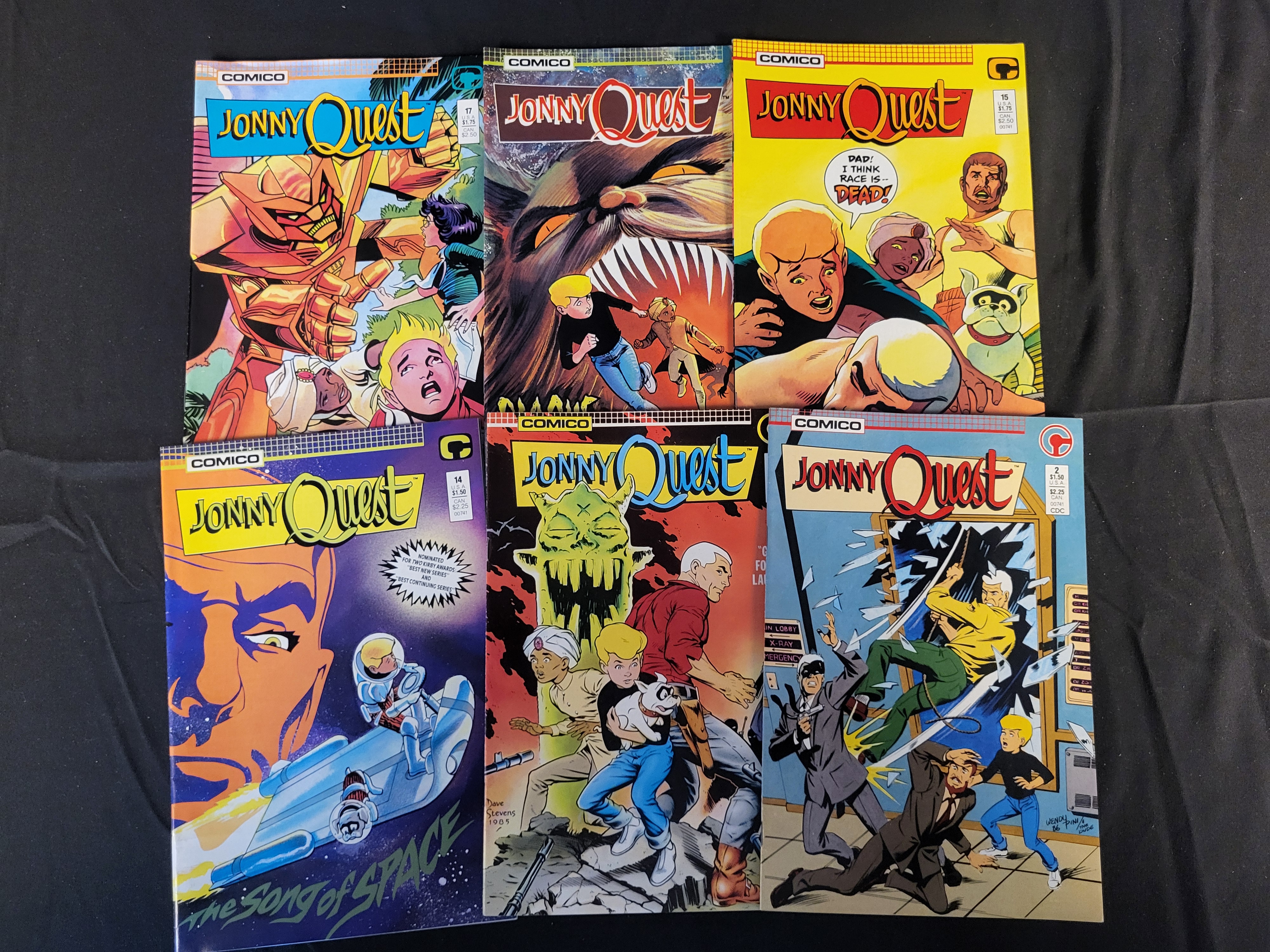 BID PER WHAT YOU SEE IN THE PHOTO, NOT THE AI GENERATED TITLES AND DESCRIPTIONS! A collection of Jonny Quest comic books published by Comico, dating to the mid-1980s. The series features characters from the Hanna-Barbera franchise, including Jonny Quest, Hadji, Bandit, Race Bannon, and Dr. Benton Quest. The group includes issue number 2, issue number 3, issue number 10, issue number 14 titled The Song of Space, issue number 15 featuring the cover text Dad! I Think Race Is– Dead!, and issue number 17. Notable cover art by Dave Stevens is featured on issues number 3 and number 10. Each book displays the Comico logo, issue number, and original retail pricing. The items are staple-bound with polychrome printed paper covers.