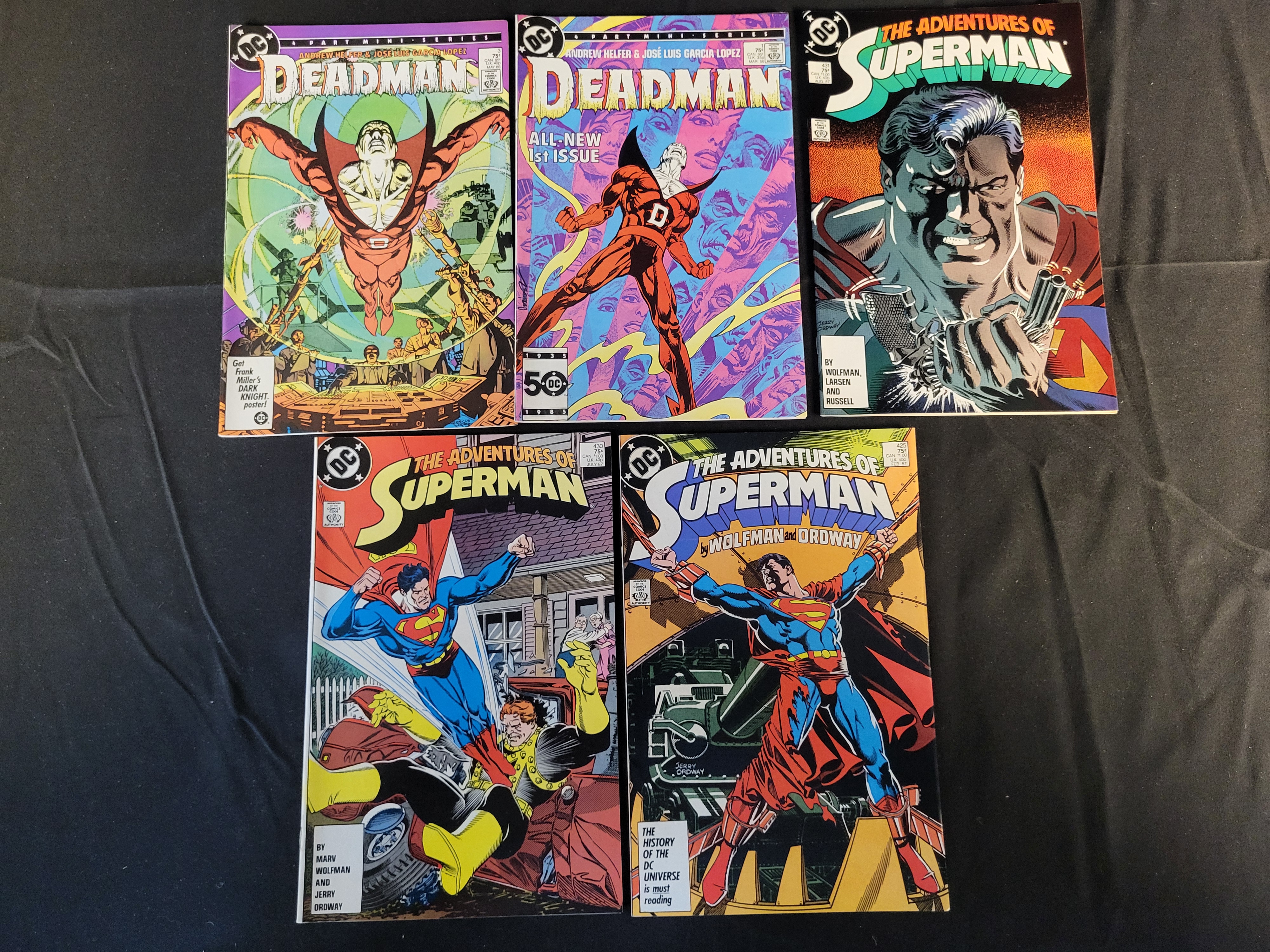 BID PER WHAT YOU SEE IN THE PHOTO, NOT THE AI GENERATED TITLES AND DESCRIPTIONS! This collection of DC comic books from the mid-to-late 1980s primarily features titles from the Deadman and The Adventures of Superman series. Included in the group are issues from the 1985 Deadman four-part mini-series by Andrew Helfer and Jose Luis Garcia-Lopez, including the first issue. The collection also contains multiple issues of The Adventures of Superman, specifically numbers 425, 430, and 431, with credits to Marv Wolfman, Jerry Ordway, and Erik Larsen. These vintage comic books are constructed with full-color covers on standard paper. The Adventures of Superman number 425 is identified as the February 1987 edition.